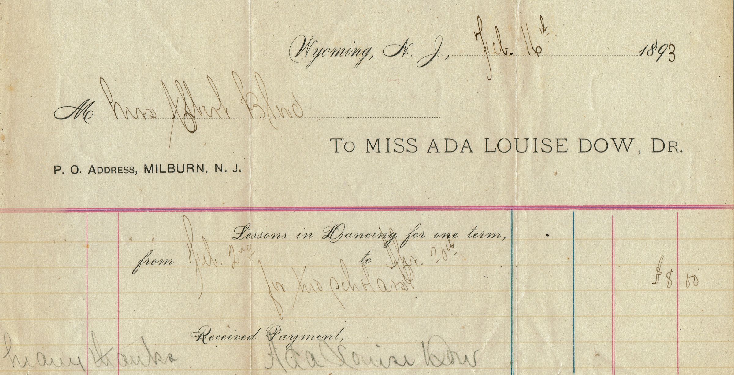 Receipt to Mrs. Albert Blood for lessons in dancing for one term from February 2-April 20, 1893 from Miss Ada Louise Dow, Dr. Wyoming, NJ, P.O. Box, Millburn, NJ. Receipt contains handwritten note: Many Thanks, Ada Louise Dow.