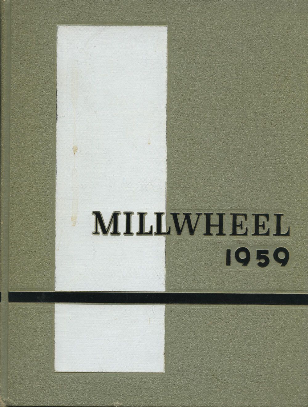 1959 hardcover Millwheel MHS yearbook from (E)Sale estate sale. No inscriptions in book to identify former owner. Purchased at, or donated by, an estate sale at 48A Forest Drive, Springfield NJ 07081 on unknown date. There is edgewear on all edges of the gray/beige cover, especially at the corners. There is a faint, ca. 2" long glue-like drip on the left side of the white panel on the front cover. Interior pages are clean and tight.Acquisition