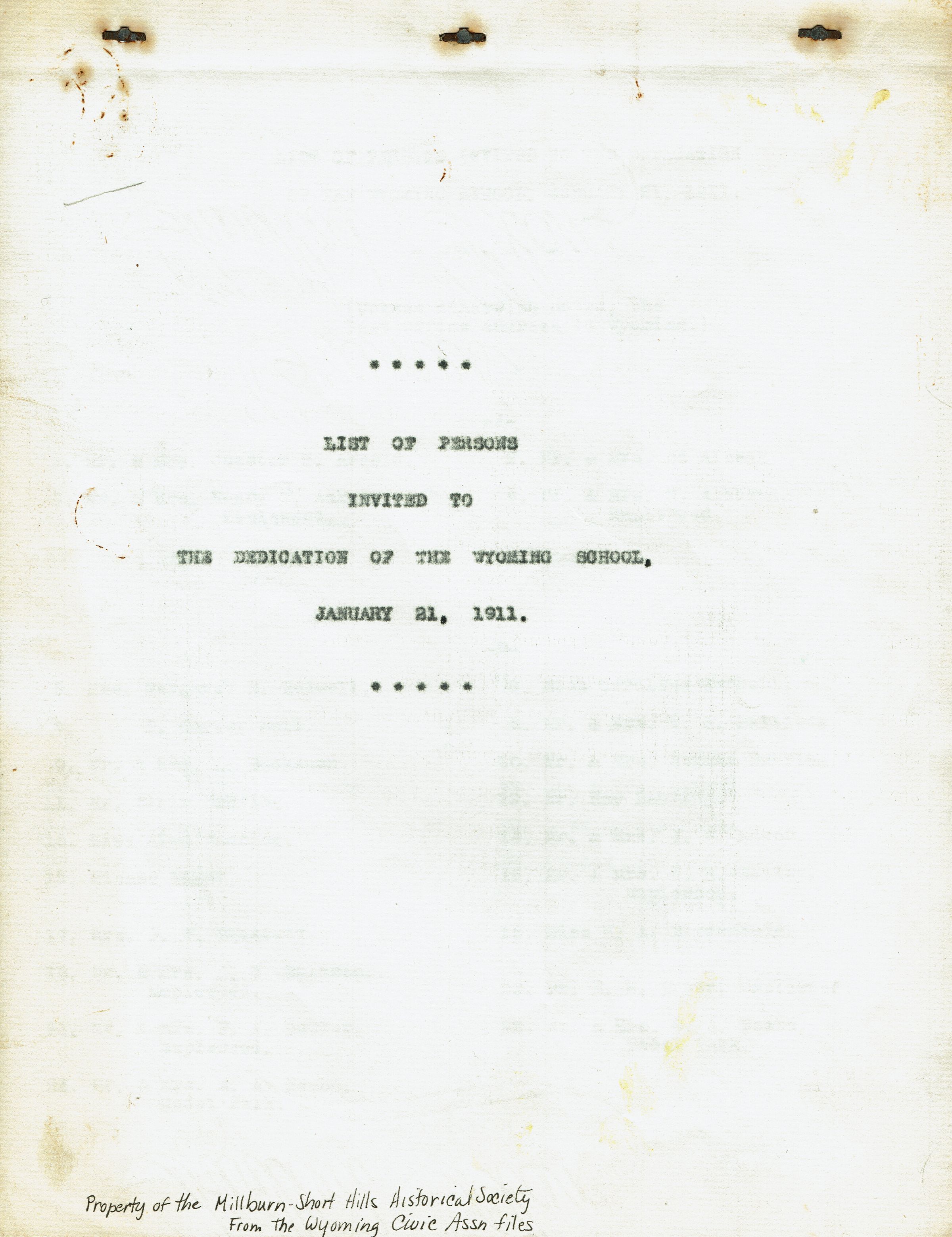 List of Persons Invited to the Dedication of the Wyoming School, January 21, 1911. 8 page typed list of 266 people invited to the dedication of the Wyoming School. List was in the collection of the Wyoming Civic Association.