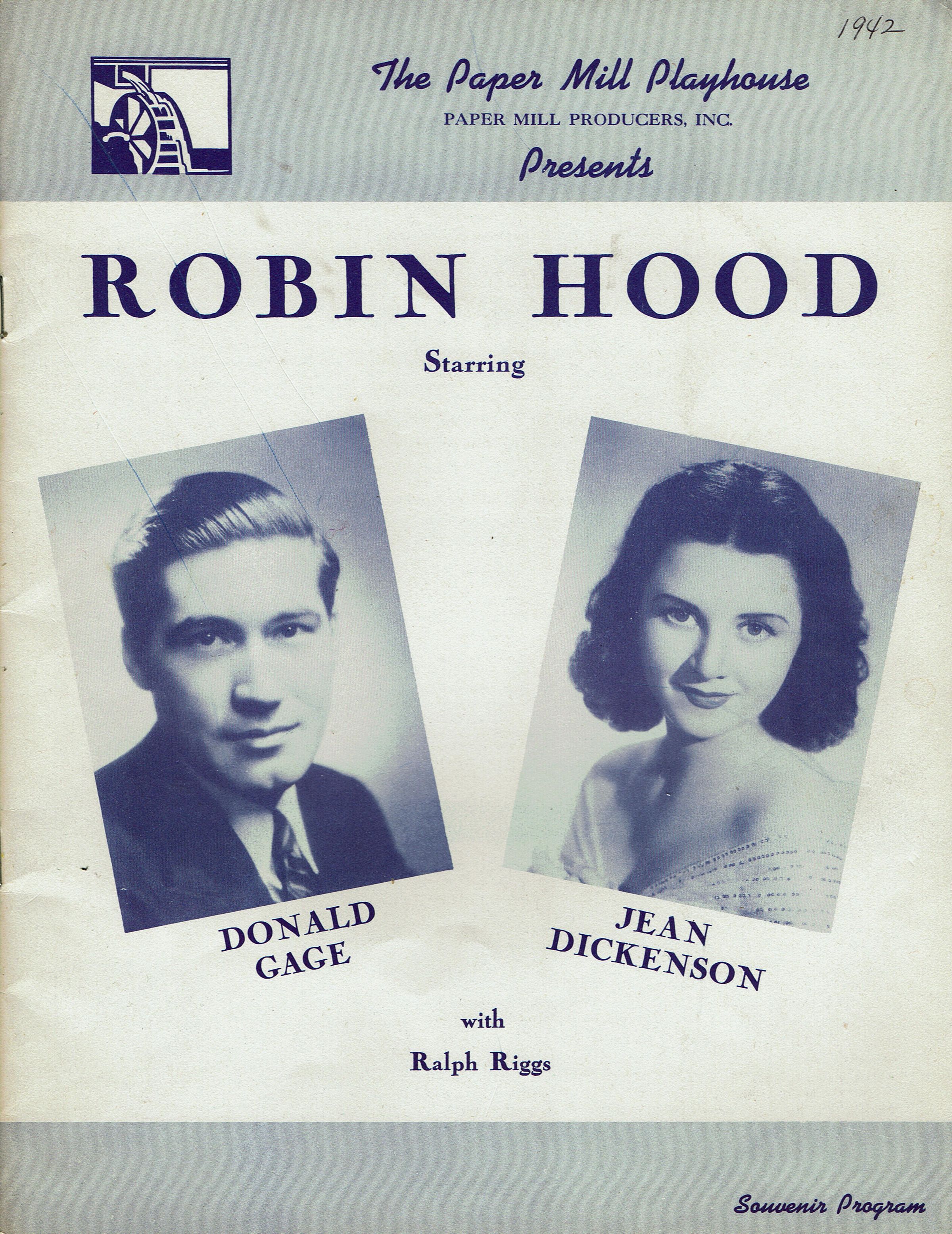 Souvenir Program for 1942 Paper Mill Playhouse Production of "Robin Hood" with Jean Dickenson, Donald Gage and Ralph Riggs. Deluxe fully illustrated program with photographs and articles about Paper Mill Playhouse. 20 pp. (Unpaginated). 8 page program included. Illustrated with advertisements for local businesses.Collection