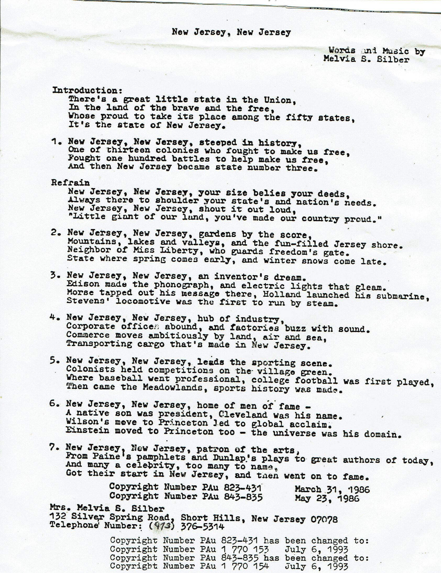 Silber: Melvia Silber, "New Jersey, New Jersey" Song, 1996Entry/Object ID