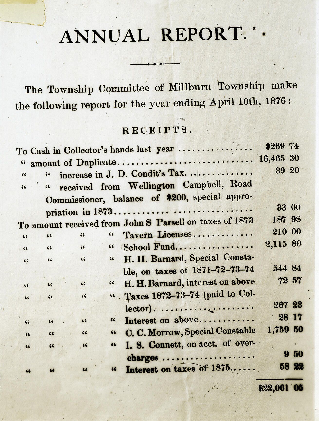 Millburn Township Committee Annual Report Receipts, Year ending April 10, 1876