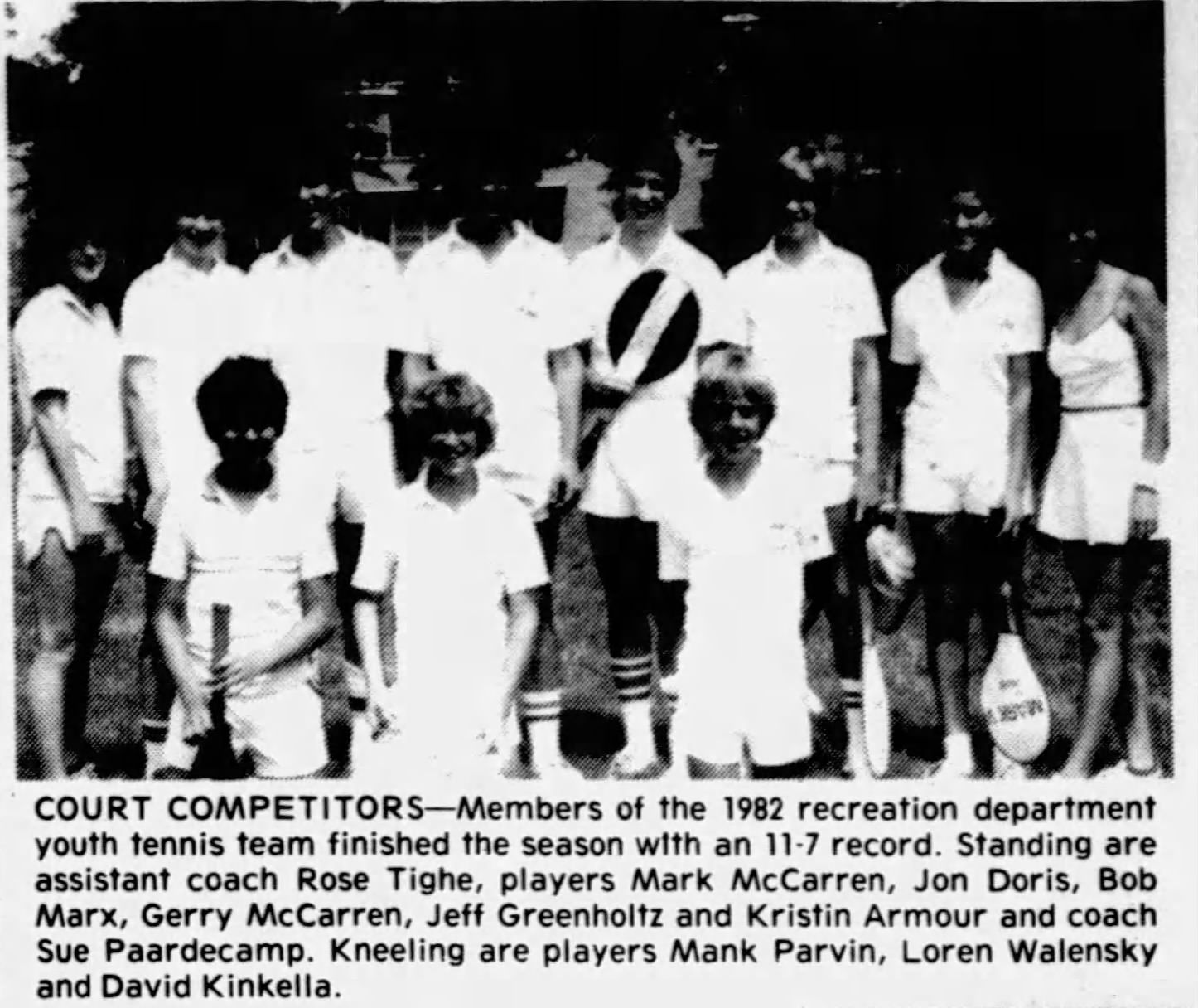 Photograph of the Millburn Department of Recreation1982 Youth Tennis Team. Pictured in the photograph are: (left to right) Standing-Rose Tighe (assistant coach), Mark McCarren, Jon Doris, Bob Marx, Gerry McCarren, Jeff Greenholtz, Kristin Armour, Sue Paardecamp (coach); Kneeling-Mark Parvin, Loren Walensky, David Kinkella.Acquisition