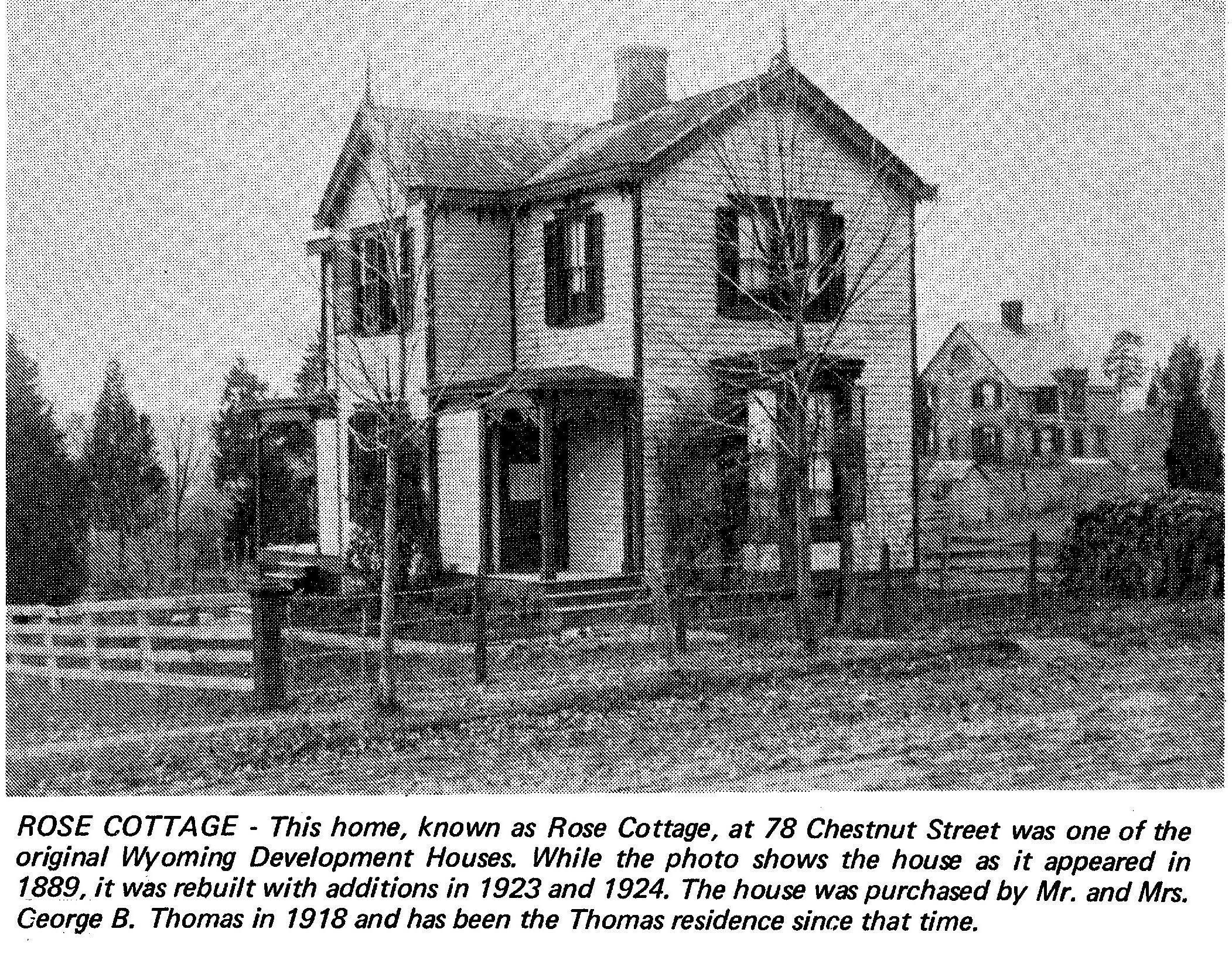 Photograph of Rose Cottage, 78 Chestnut Street, as it appeared in 1889. The house was one of the original Wyoming Development houses. The house was purchased by Mr. and Mrs. George B. Thomas in 1918 and was rebuilt with additions in 1923 & 1924. The Thomases still lived in the home, when this photograph was published in the October 17, 1968 issue of The Millburn & Short Hills Item.