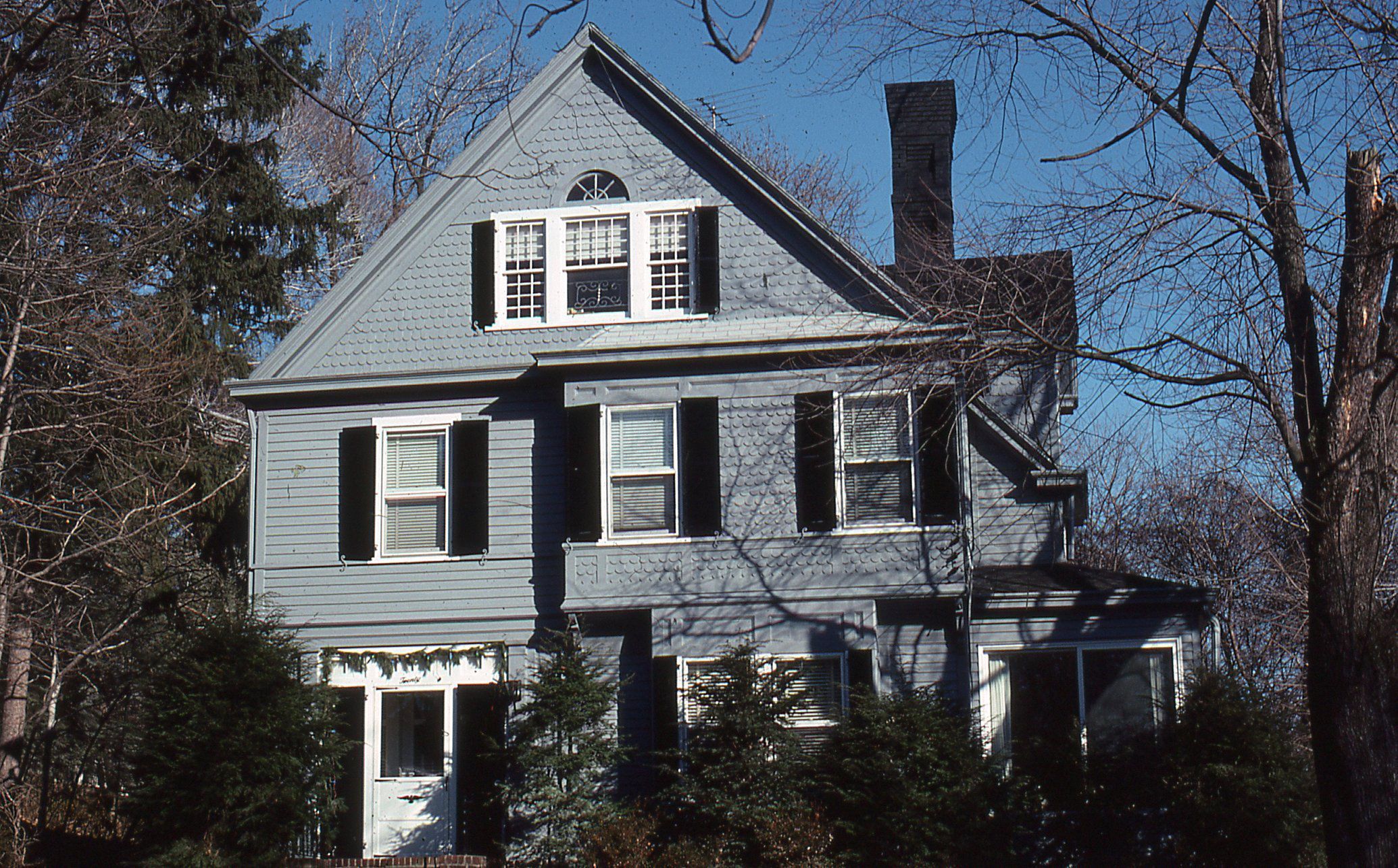 Photographs of 20 Highland Avenue taken by Owen Lampe in January 1976. Unnumbered Hartshorn House, built 1889. Queen Anne style. Features: oriel bay and Palladian windows in front gable, ornamental chimneys, fish scale shingles.Photograph Details