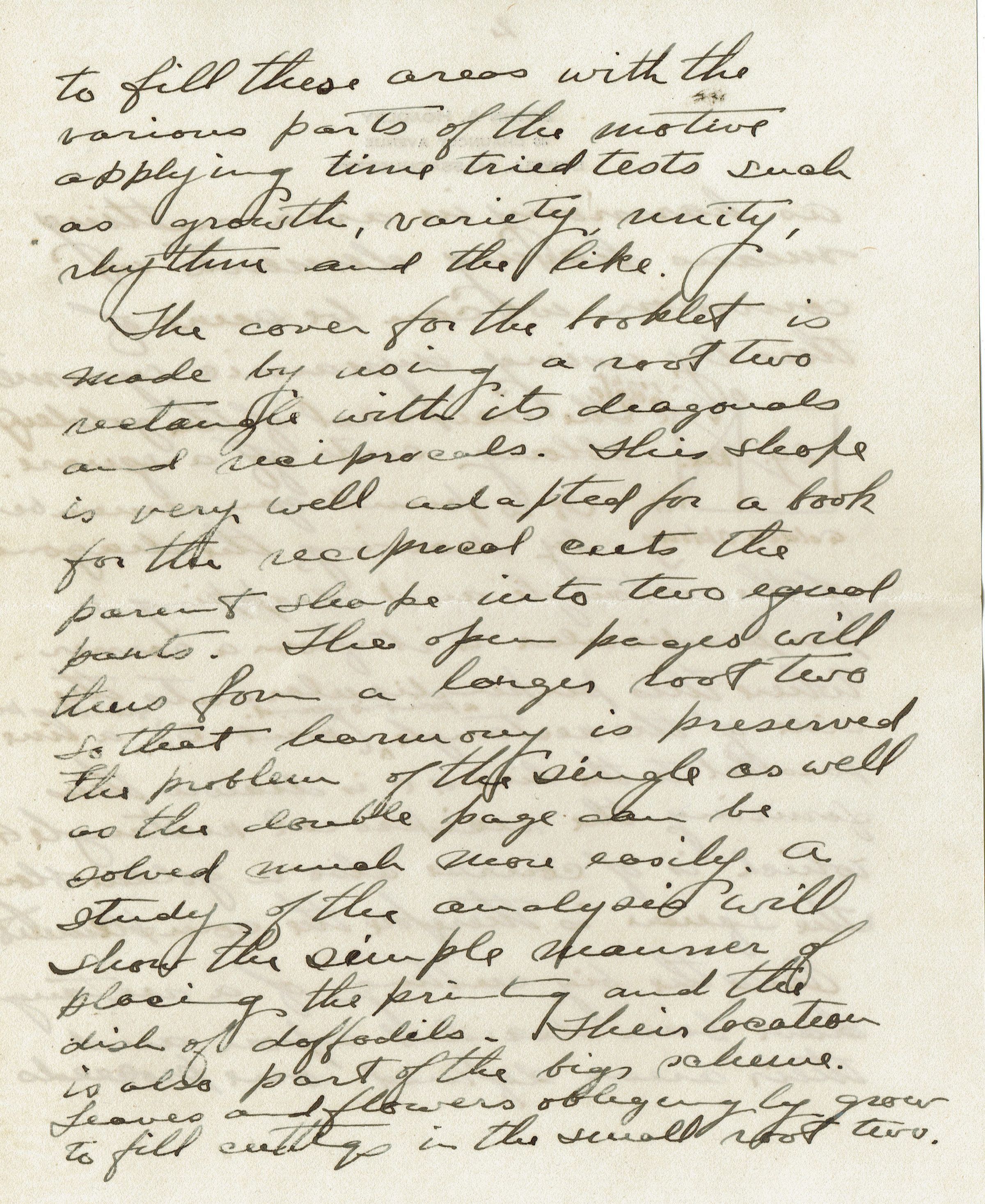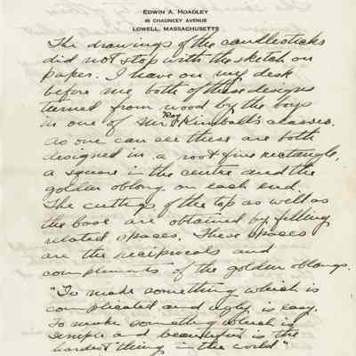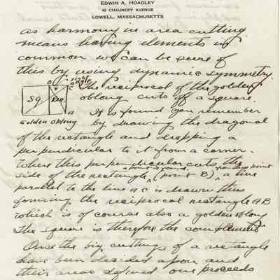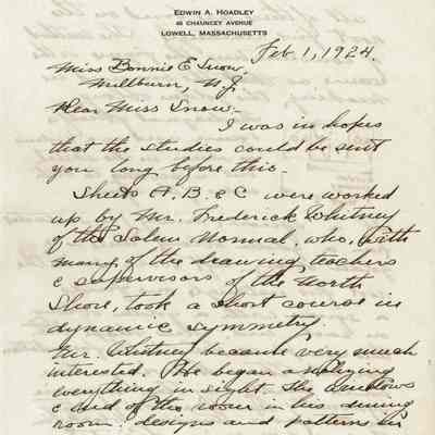 6 page letter, sketches and published pieces dealing with the design concept of Dynamic Symmetry from Massachusetts educator Edwin A. Hoadley to Bonnie Snow in February 1924.Collection