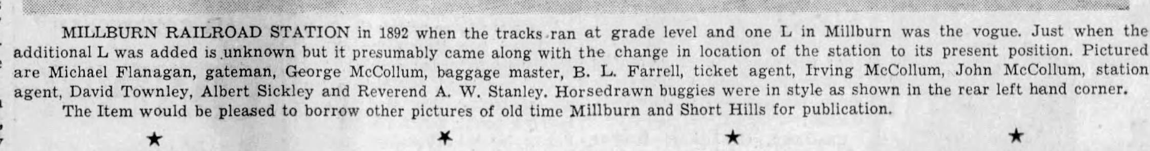 The photograph first appeared in the April 29, 1948 edition of The Item and was reprinted in the 1957 Centennial Book, "Milburn railroad station in 1892 when the tracks ran at grade level and one L in Millburn was the vogue. Just when the additional L was added is unknown, but it presumable came along with the change in location of the station to its present position. Pictured are: Michael Flanagan (gateman), George McCollum (baggage master), B.L. Farrell (ticket agent), Irving McCollum, John McCollum (station agent), David Townley, Albert Sickley and Rev. A.W.Stanley. Horsedrawn buggies were in style as shown in the rear left hand corner."