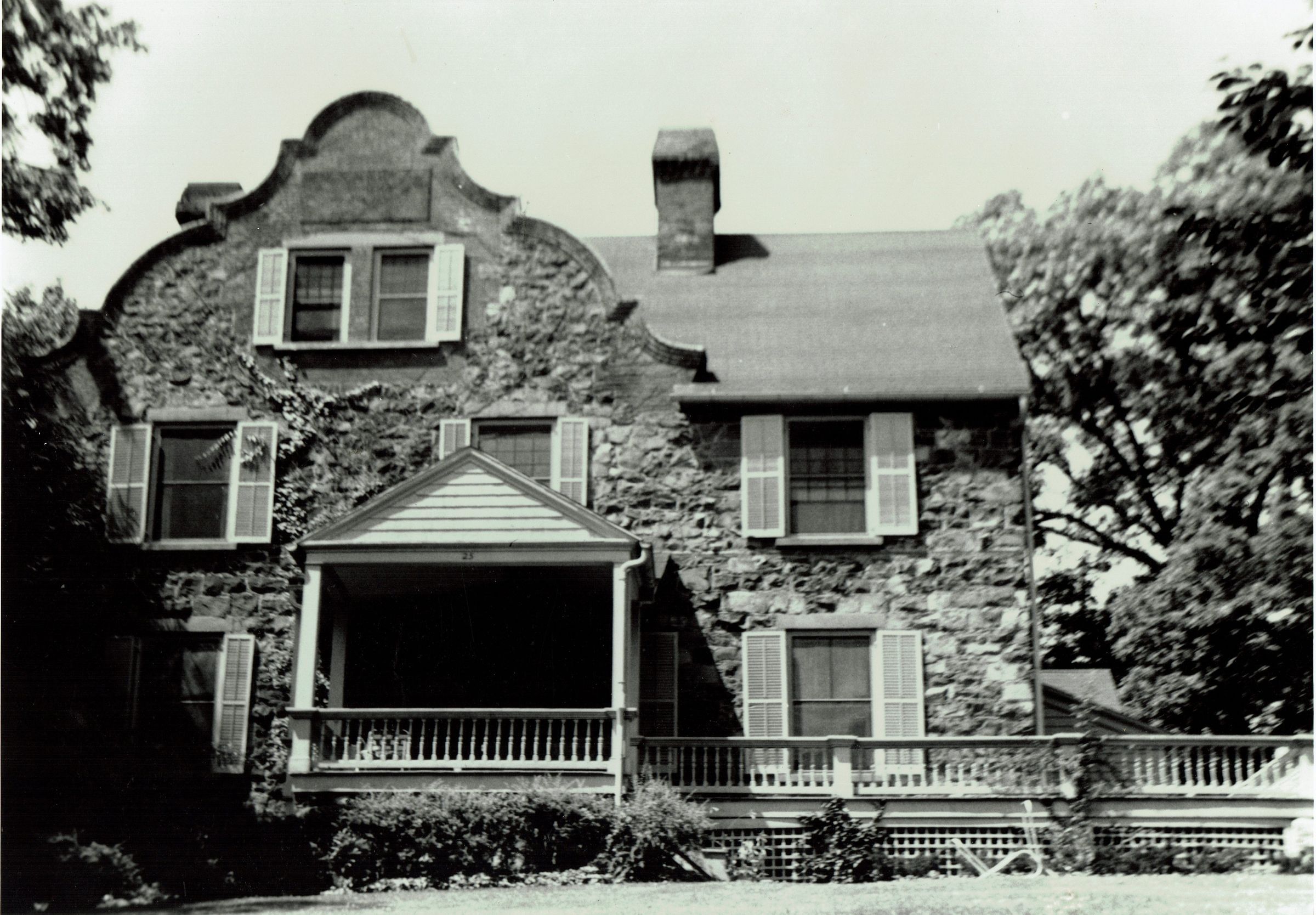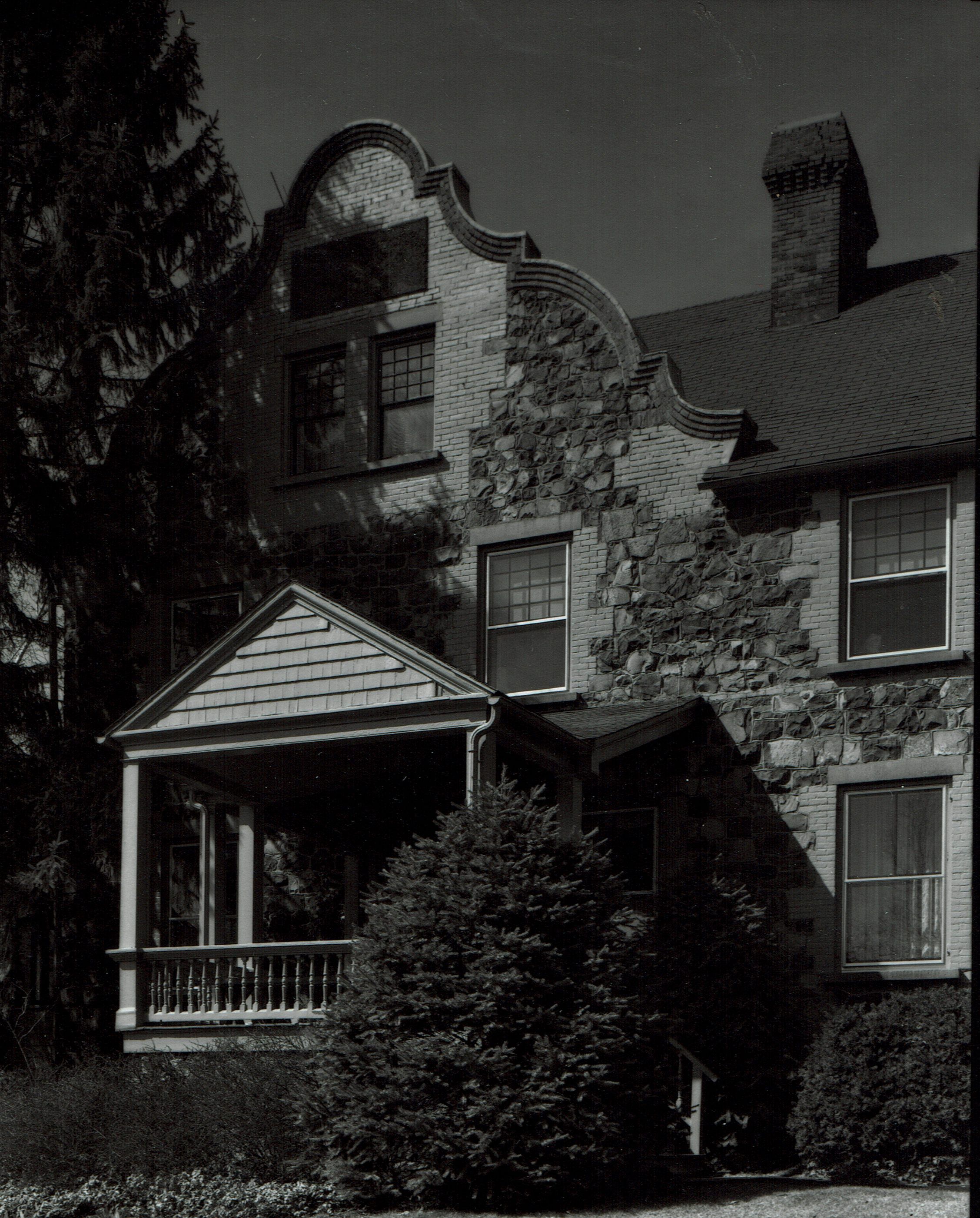 Photographs of 25 East Lane, possibly taken by Owen Lampe for Sticks, Shingles & Stones, but not published. One of the original Hartshorn Estates, Inc. houses (unnumbered). The house was constructed in c. 1888 in the Medieval Revival Style (Elizabethan Revival with Jacobean features and curved stepped gables from the Netherlands). Also features ornamental brick chimneys.