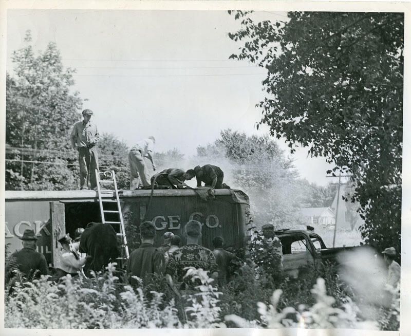 Ca. 1940's press photo of a Rimback Storage Company truck accident, apparently near Scranton PA. The truck in the other photo related to this accident advertises "Long Distance Moving," which may be what it was doing in PA. Smoke appears to be coming from the top, and a man seems to be carrying out of the side of the truck a covered item, so there may have been a fire inside that led to the truck going off the road. The back of the photo is marked: "Montgomery -- Photographers; Commercial - Aerial; Home Portraiture; 216 Coal Exchange Bldg; Scranton 3, PA; Telephone 9476 Reorder No." and handwritten in the Reorder No. line is "D-1210."