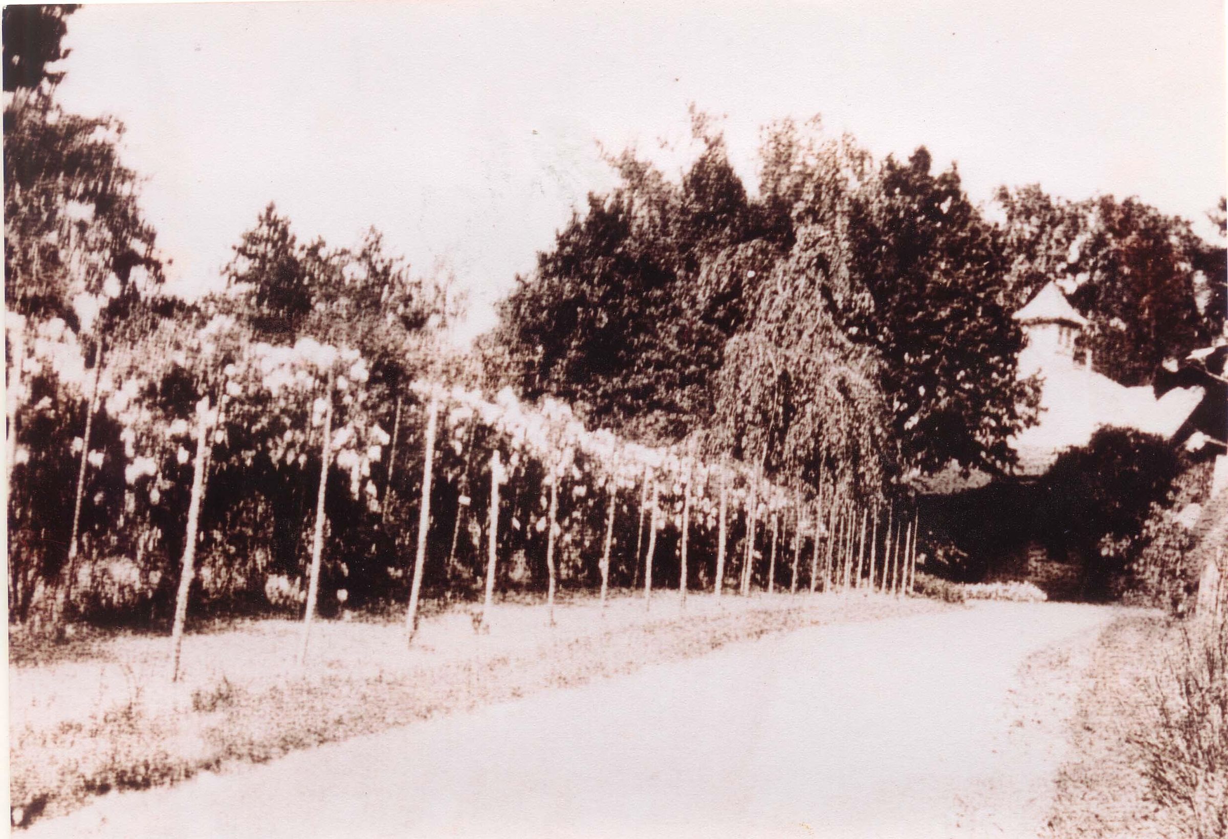 B/W reprint of an early photo of the driveway to 26 Crescent Place, the former carriage house for Stewart Hartshorn. Donor note says the photos (reprints? originals?) were given to her by former owners of 26 Crescent Place, Susan and Robin Dunlap. The driveway is lined with narrow, tall, wooden poles.Acquisition