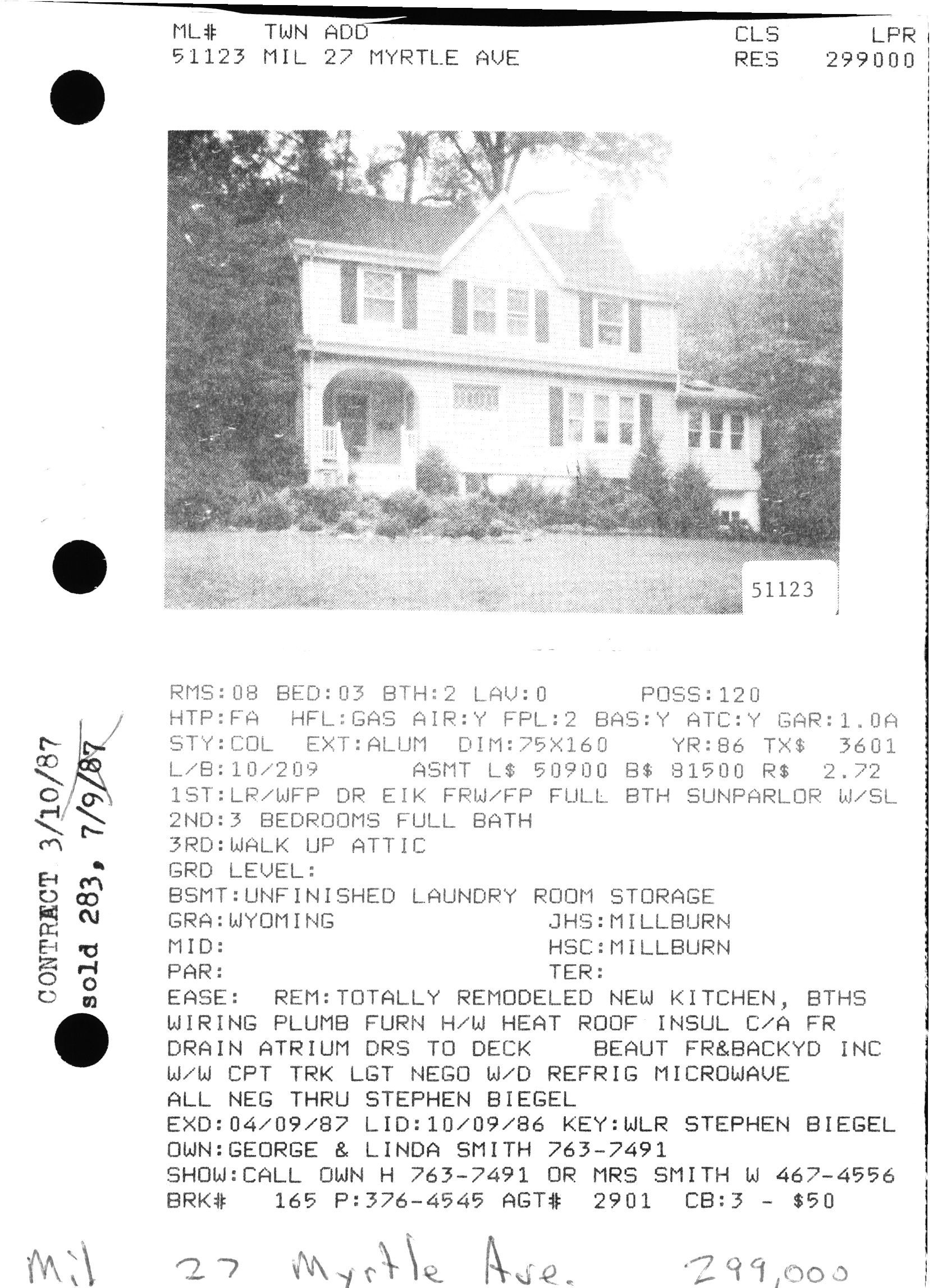 Information about Myrtle Avenue in the Wyoming section of Millburn from the 1978 David Gibson Historic Sites Survey. The house was built in c. 1906. Previous owners were: Clara Browen & Floyd Nelson, Oakes Realty Co. (1912), Raymond Brush (1918), John Lyons (1958), Wayne and Phyllis Heron (1973).