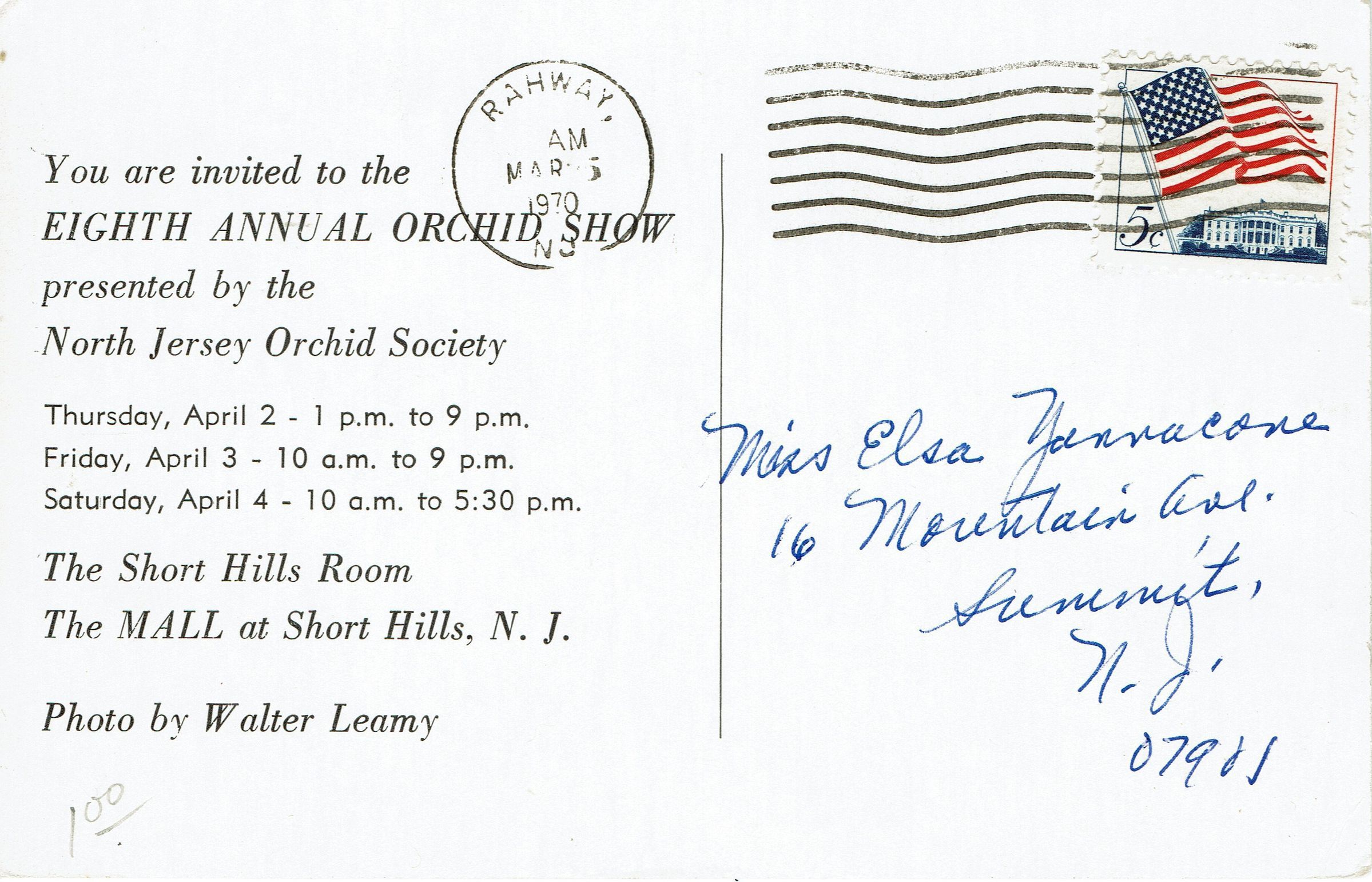 Postally used promotional color postcard for the Eighth Annual Orchid Show presented by the North Jersey Orchid Society, April 2-4, 1970 at The Short Hills Room, The Mall at Short Hills. Postmarked Rahway, March 15, 1970.Collection