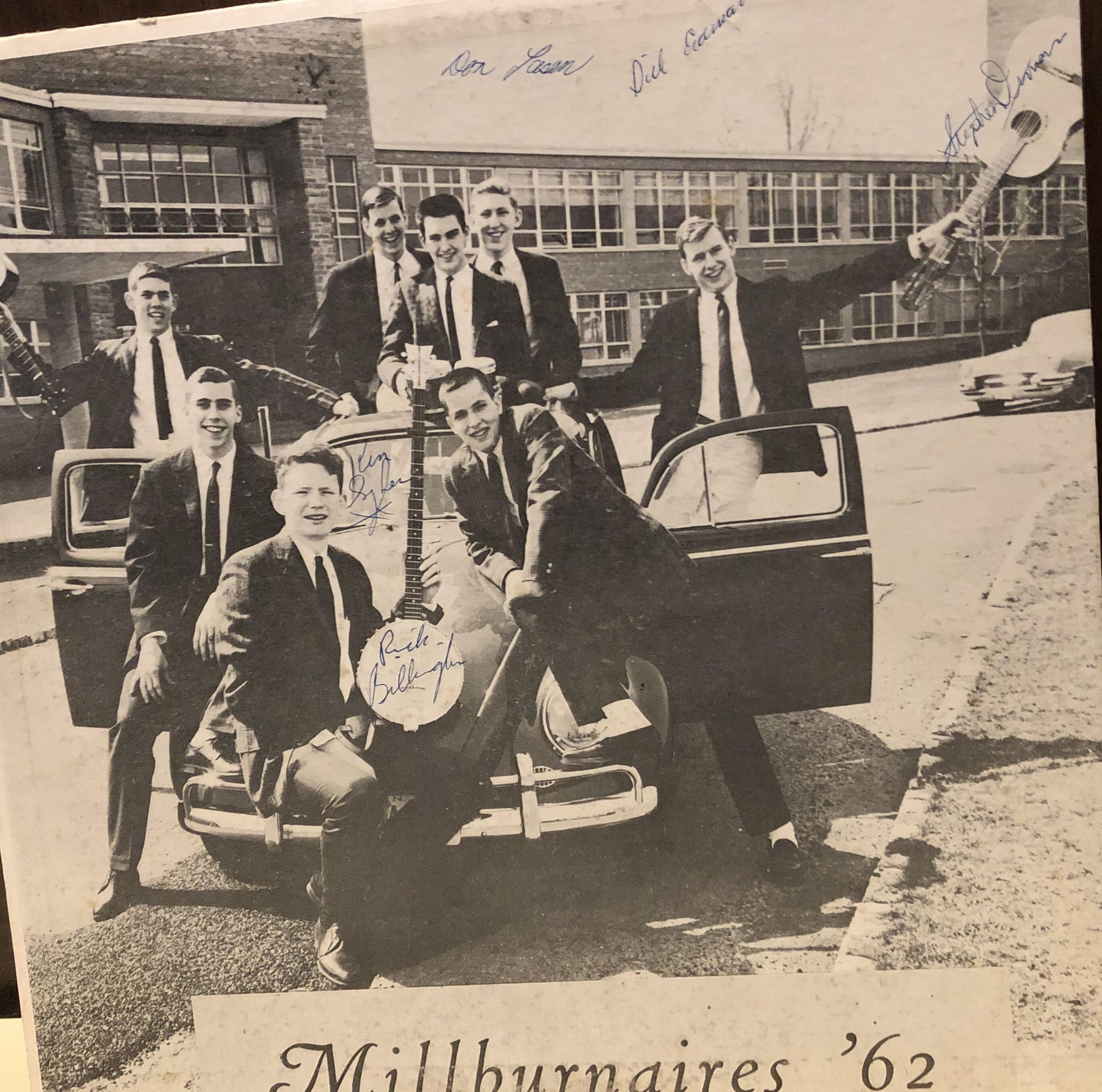 Millburnaires '62 record album featuring band signatures on front cover. Features: Ken Sykes, Don Larsen, Jack Palmer, Dick Erdman, Rick Billingham, Bill Settlemyer, Denny Cryer, Steve Oxman. 1962 was the second year that the popular Millburn High School band made a record. The first was in 1958, when the members of that group managed to sell 600 copies. Through their contacts with recording engineer Deryck Waring (member of Christ Church choir), the 1962 group were able to record the 12 song album. The record was sold for $2.95.Collection