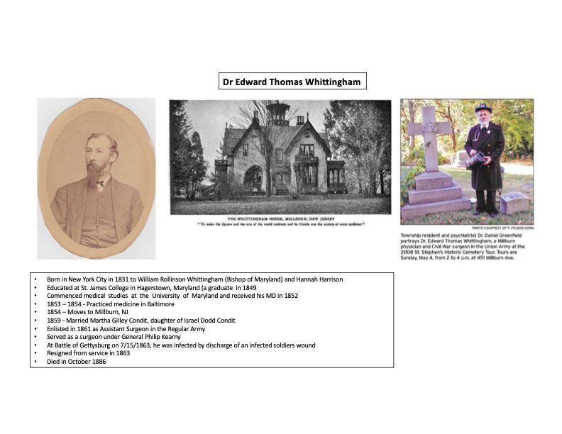 Photo from History of Union County. Edward Thomas Whittingham was born April 22, 1831. He graduated with a medical degree from the University of Maryland at Baltimore in 1852 and moved to Millburn in 1854. He was an assistant surgeon with the U.S. Army during the Civil War. In 1859, he married Martha C. Condit, daughter of Israel D. Condit of Millburn. Dr. Whittingham died on October 26, 1886 and is buried in St. Stephen's Cemetery, Millburn, NJ.Collection