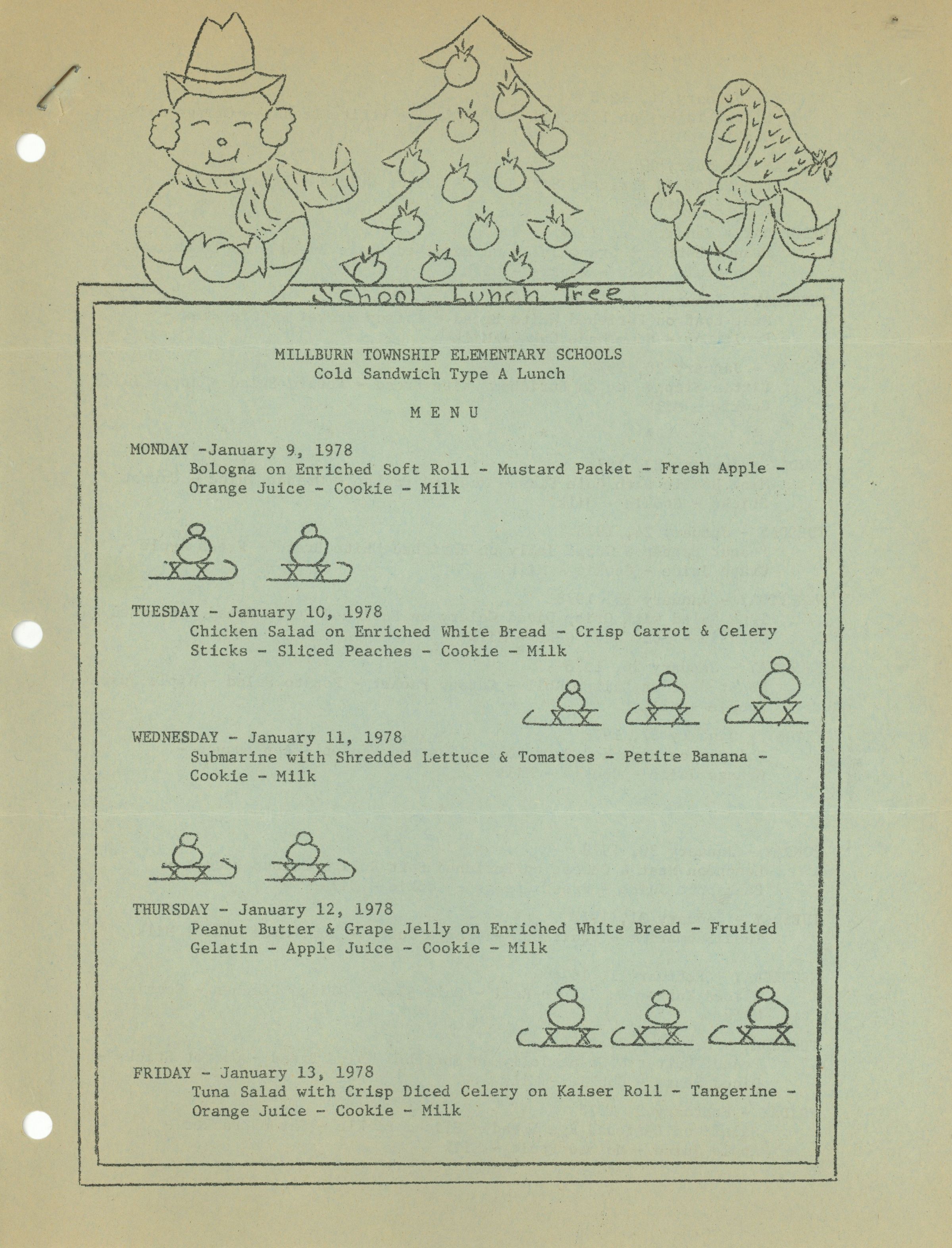Millburn Schools: Elementary School Lunch Menu, 1978