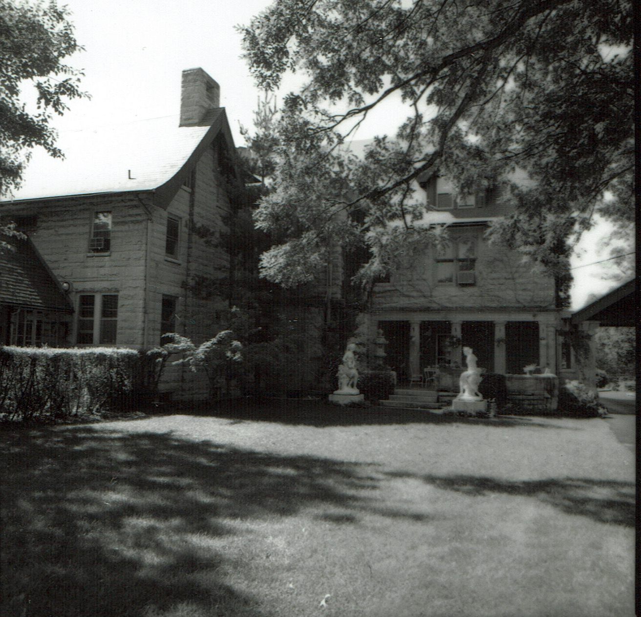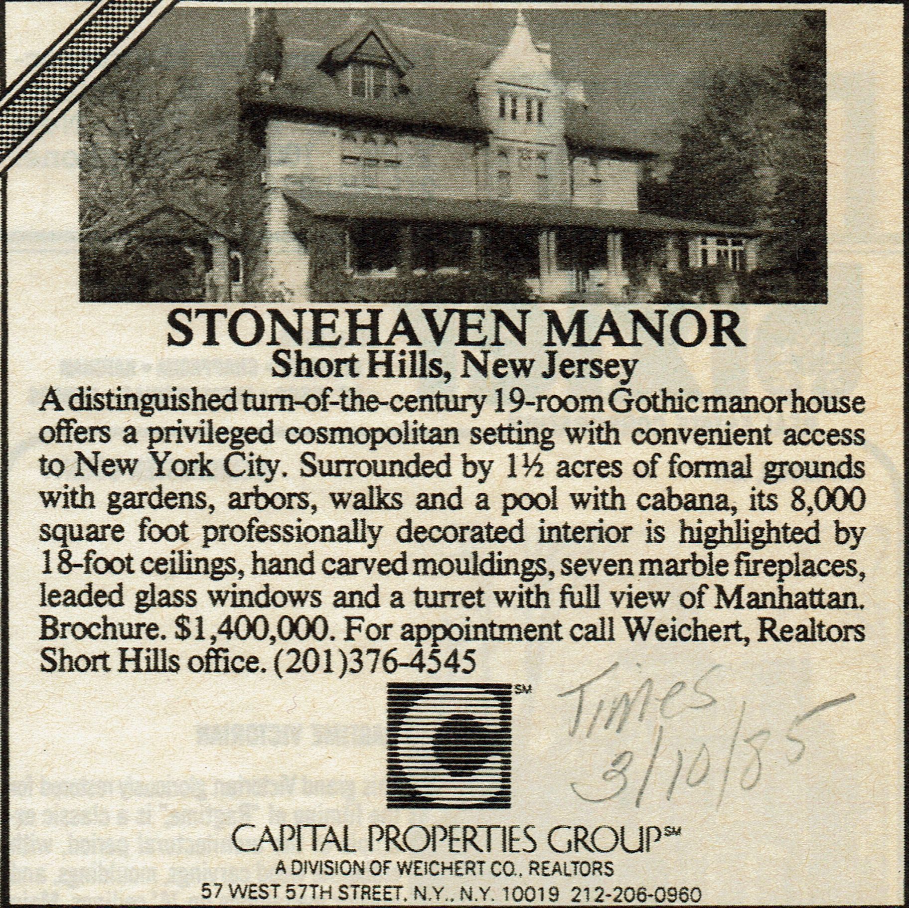 Photographs of 303 Hobart Avenue, known as "Stonehaven," or "Twin Oaks" from the 1978 David Gibson Survey. Also included is a 1985 advertisement for the property from the Luxury Homes section of the New York Times Magazine. According to the 1979 report by van Reintjes, the house was built by Gilbert G. Brown, son of George Brown, who was the founder of a marble and stone cutting firm in Newark. The building was constructed from 1899-1902 using Indiana Limestone.