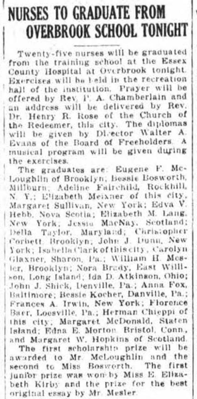 Photograph of the Essex County Hospital nurses from c. 1914. The photograph may depict the June 1914 graduating class, which contained 25 students, one of whom was Bessie Bosworth. Bessie enlisted in as an army nurse on December 27, 1918 and was subsequently sent to Camp Jackson in South Carolina.Acquisition