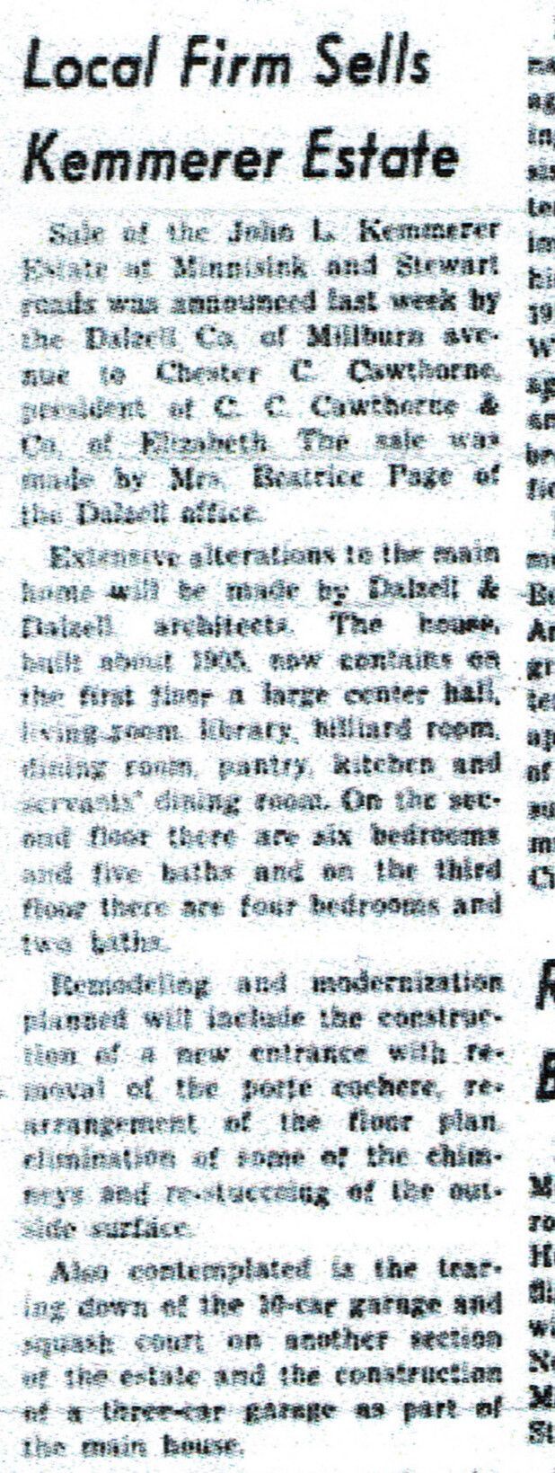 Photograph of 36 Stewart Road. Inscription on back of photo reads "James Shackleton Photographer, Short Hills, NJ Photo Jan/15/03. Residence of J. L. Kemmerer." John Leisering Kemmerer (1911-2002). The house, at Stewart and Minnisink, was sold to Chester C. Cawthorne in August 1946. A description of the interior is contained in the August 8, 1946 edition of The Millburn-Short Hills Item.