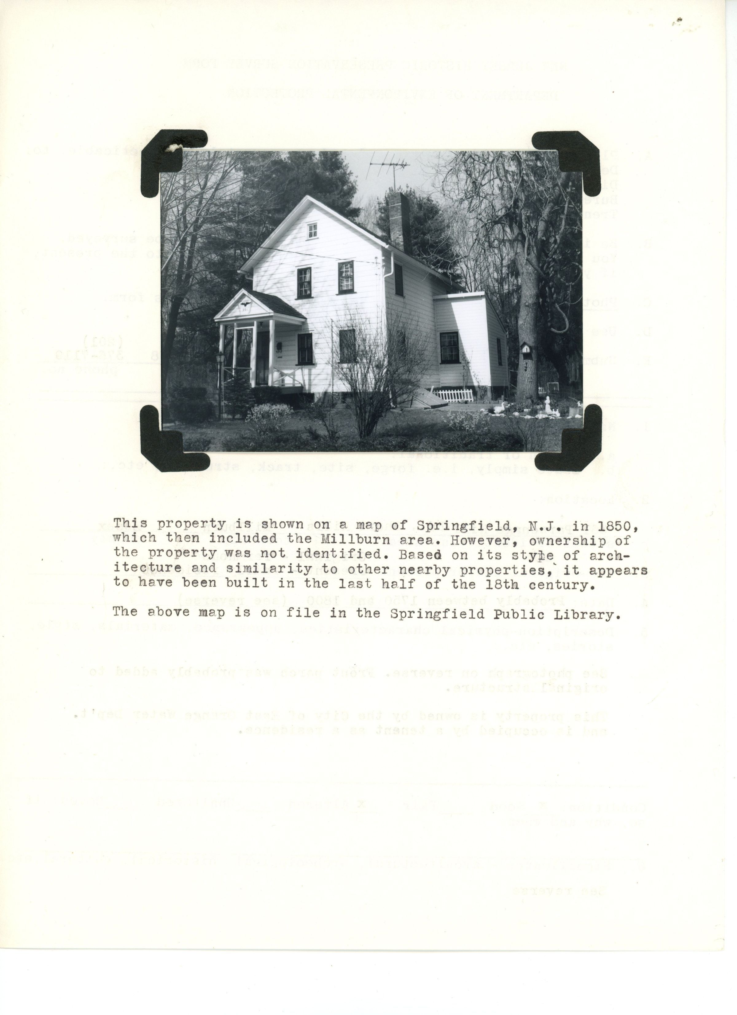 Photograph of farmhouse at 361 Parsonage Hill Road, Short Hills from the NJ Historic Preservation Survey Form (Department of Environmental Protection. The house is a 2 1/2 story Colonial clapboard farmhouse with a front porch added.The house was renovated in 1982 (renovation photographs in house file). The property is owned by the City of East Orange Water Department and in the 1980s, was occupied by a tenant as a residence.