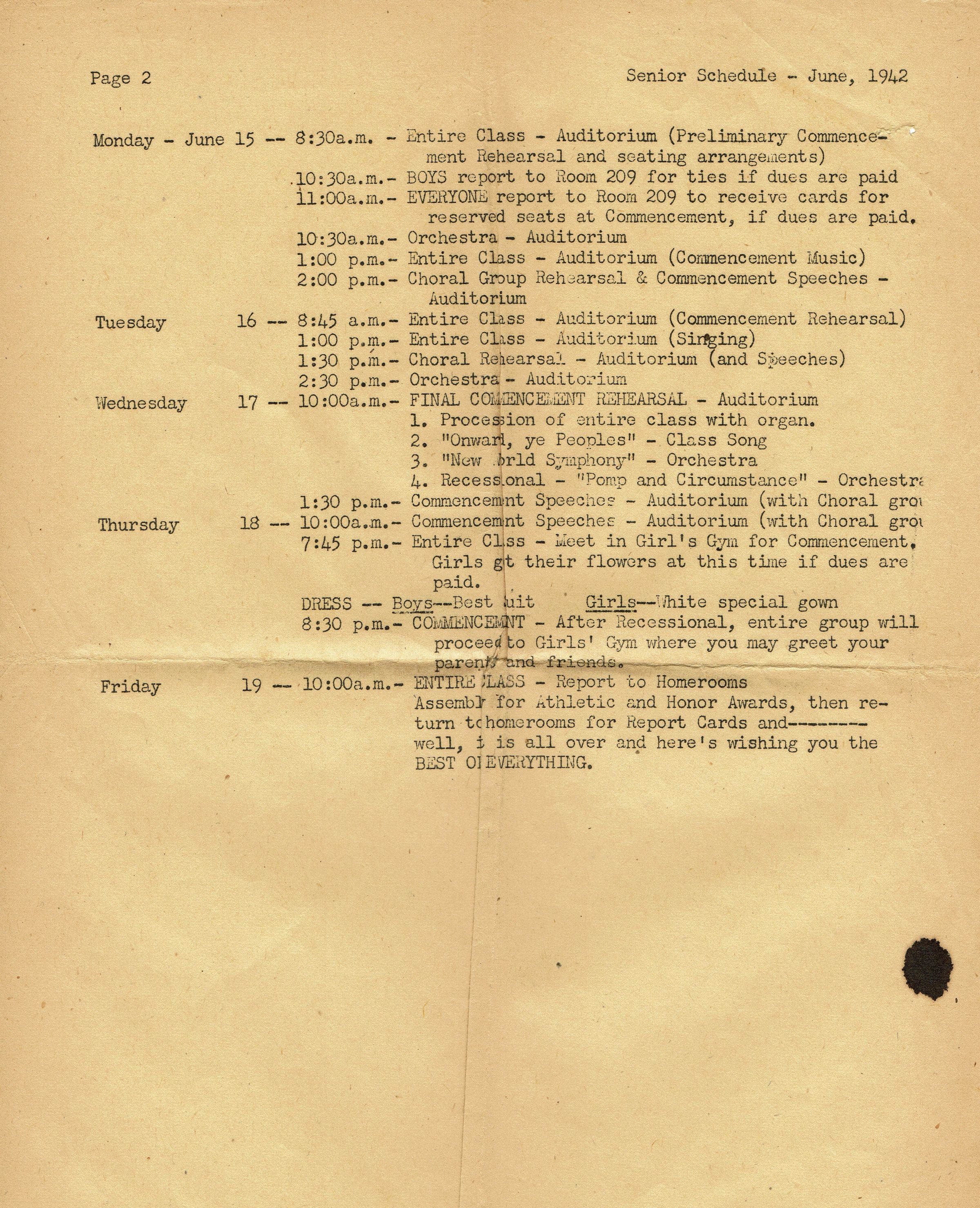 Two-page typed Senior Class Schedule for Millburn High School Students. May 18-June 19, 1942. Schedule contains information for graduation exercises.Acquisition
