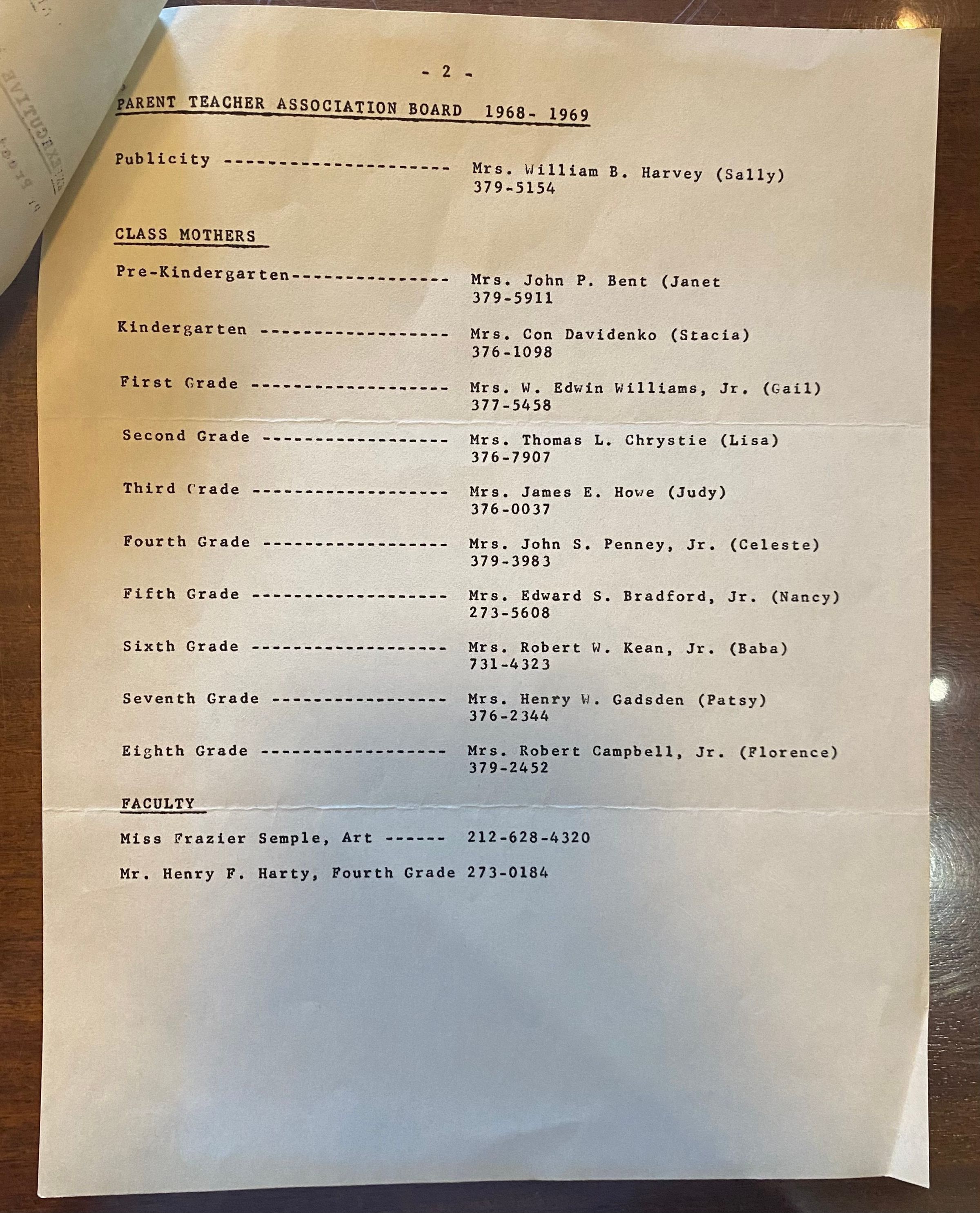 Two pages (stapled) listing the details of the members of the Short Hills Country Day School's Parent Teachers Association Board (1968-1969). It lists the executive committee, committee chairmen, class mothers, and faculty involved. Detials provided for each person include their names, their positions, and their phone numbers.Acquisition