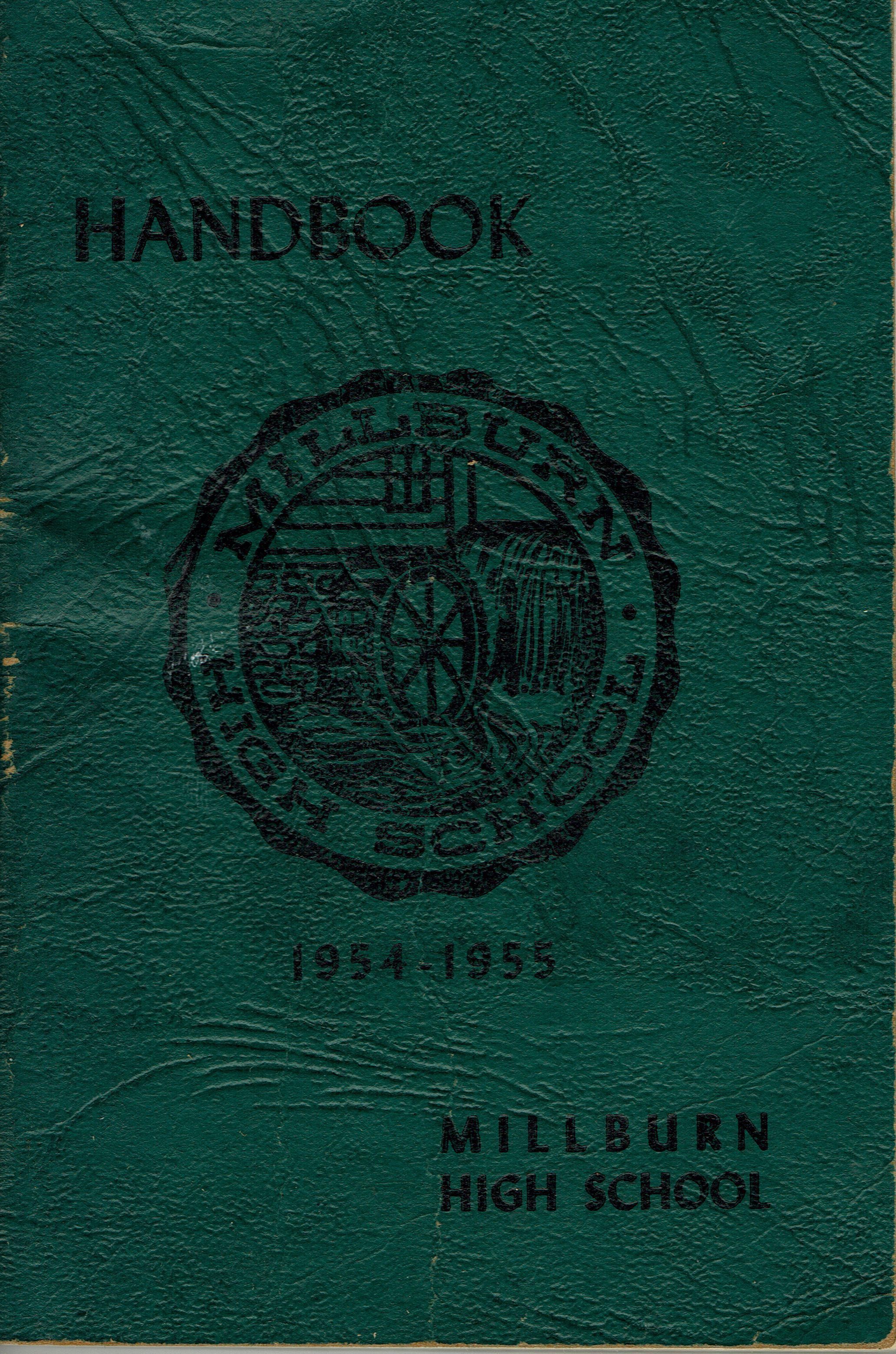 Millburn High School Handbook 1954-1955. Contains MHS cheers and songs, history of the Millburn High School from 1892-1955 (with plans for opening the new building in September 1955), faculty, regulations, curriculum, Clubs & sports. 131 pp.Acquisition