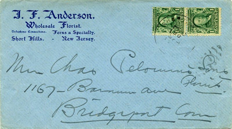 Cancelled blue envelope sent by J.F. Anderson to what looks like Mr. Chas. Pelomm & Sons, but was supposed to be Charles Pflomm & Sons. The return address (upper left) is printed in dark blue ink and is: "J.F. Anderson,; Wholesale Florist; Telephone Connections. Ferns a Specialty; Short Hills - New Jersey" The penciled, handwritten address appears to say: "Mr. Chas Pelomm & Sons Florist; 1167 Barnum Ave; Bridgeport Conn" A florist's by the name of Charles W. Pflomm (&) Son appears in a 1913 Bridgeport CT directory, at 1167 Barnum Avenue. The cancellation date cannot be read, so the circa 1913 date for the envelope is estimated from that. There are no contents in the envelope, which was opened along the right edge. All edges of the envelope are slightly yellowed; minor ripples along adhesive along seams; otherwise unblemished. Purchased on eBay from Harold Williams (oldhal) at hwilliams157@comcast.net; 1809 Winding Oaks Way, Naples, FL, for a total of $10.70Acquisition