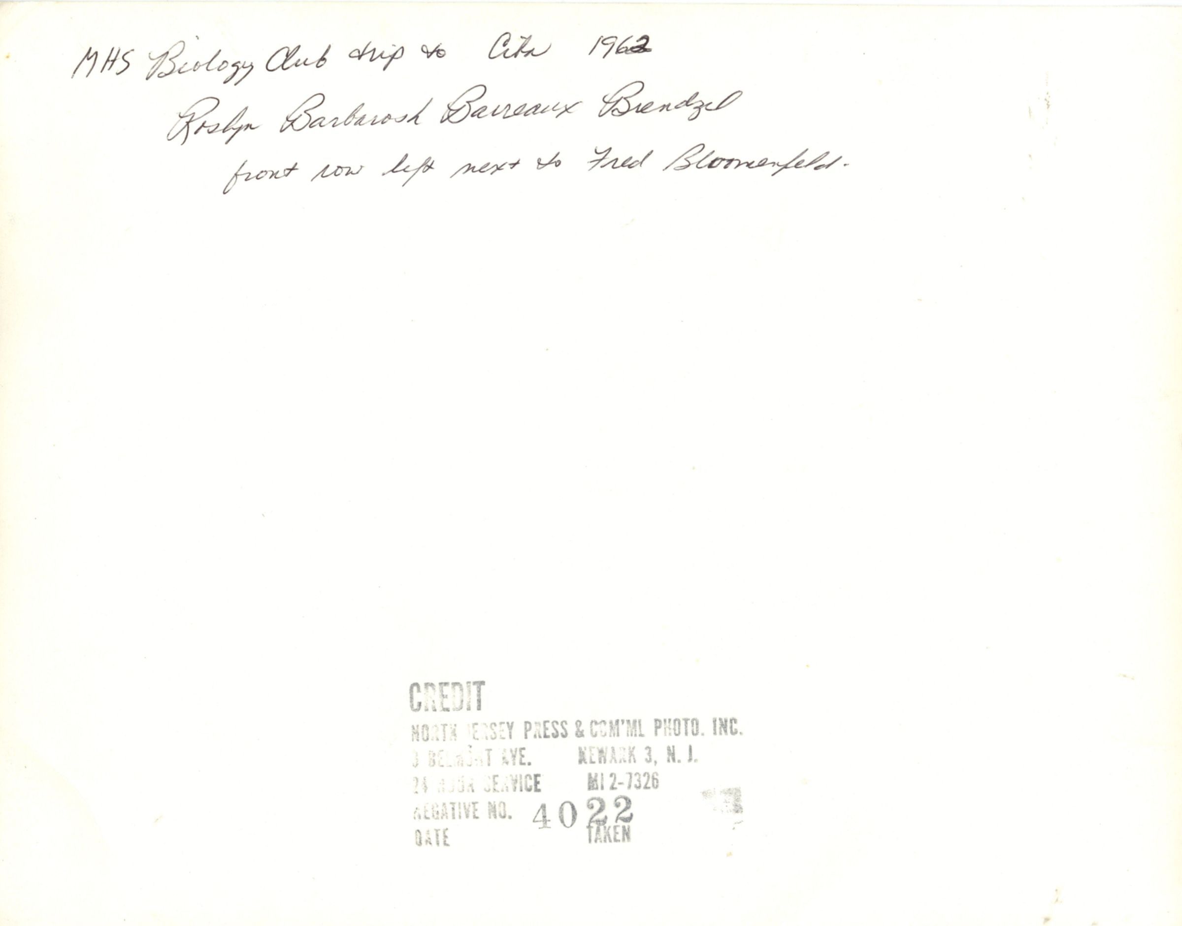 Photograph of Millburn High School Biology Club trip to (?). Roslyn Barbarosh Barreau Brendzel pictured in the front row next to Fred Blumenfeld (faculty advisor).Acquisition