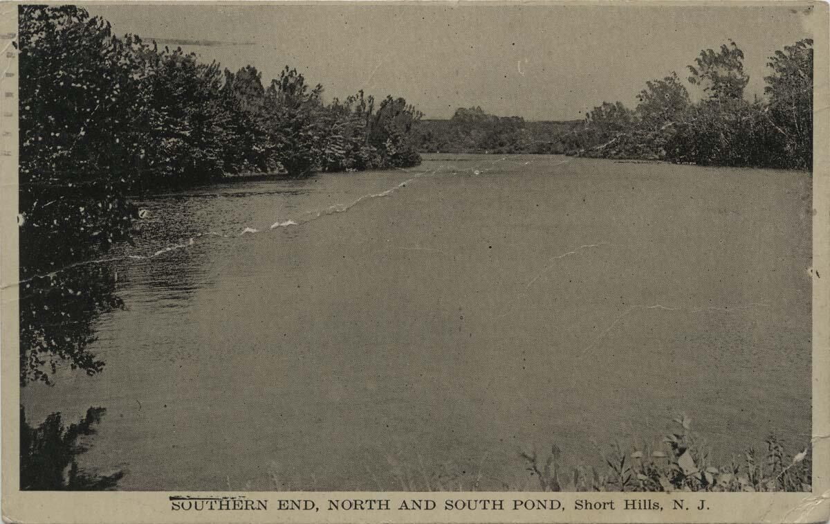 Real-photo postcard of North and South Ponds, entitled "Southern End, North and South Pond, Short Hills, N. J.", sent to Mrs. H.W. Frost, Center Tuftonboro, New Hampshire. The handwritten message on the back of the divided-back postcard states: "We just woke up to the fact Bess ought not to come to W. two days right off. So now we are planning to have Dad arrive Tuesday so Uncle Henry can take him up his regular trip unless we hear differently from you. All O.K., Lovingly -- M" The cancellation mark on the back is marked: "Short Hills N.J.; April 6; 10:30 AM; 1921" The card has overall light yellowing, especially around the edges. Both sides of the card are very lightly soiled and lightly foxed. The corners are bumped and there is edgewear, There is an diagonal crease across the card, from the middle of the left edge (front of the card) to 1/2" from the top right corner.Collection