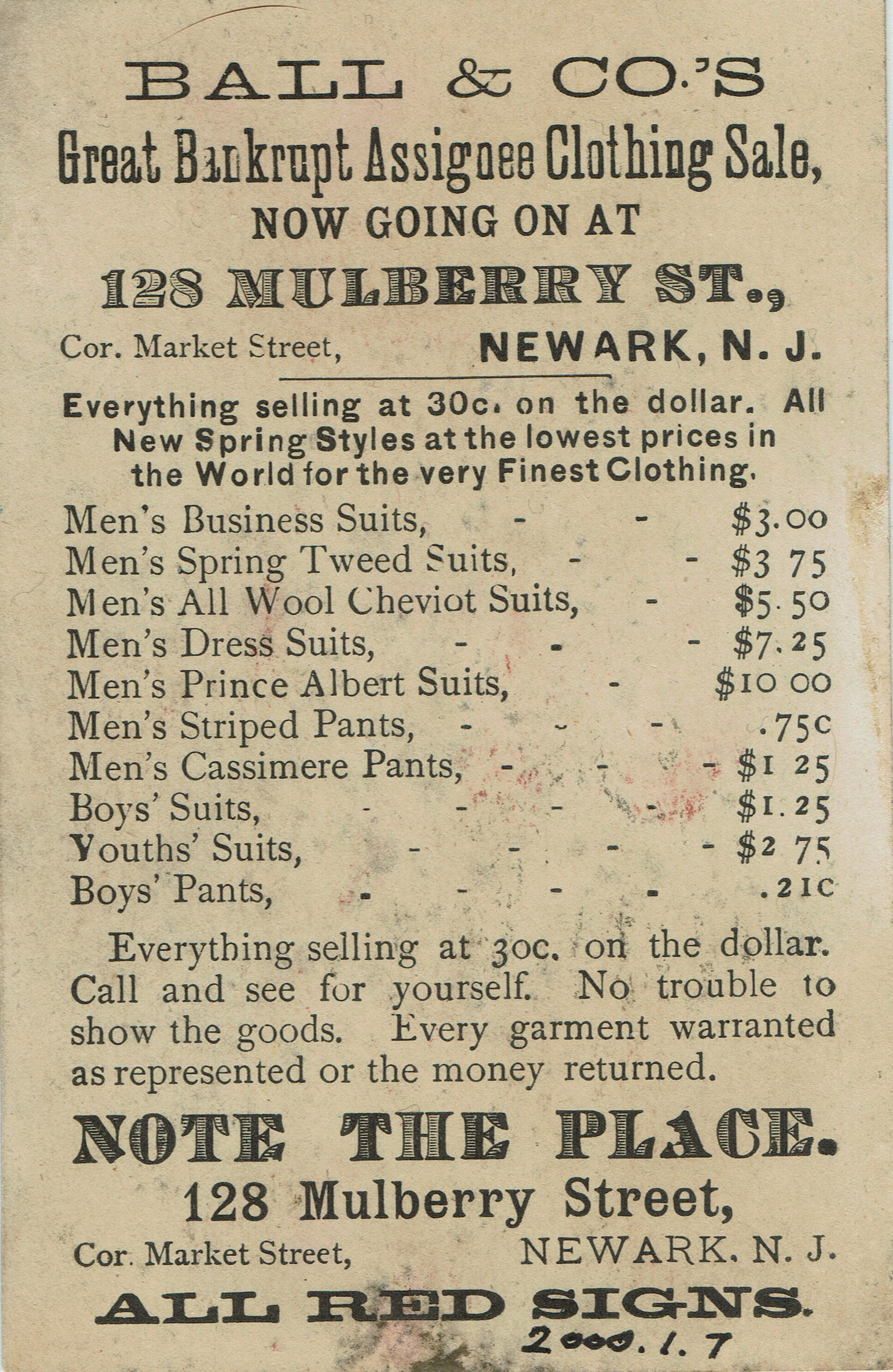 Advertising Cards from Crawford's Melrose Cigars (2), Ball & Company Clothing Store, Colyner & Company Clothiers, Hayne & Company Furnishings from the collection of Mary Gallitelli.Acquisition