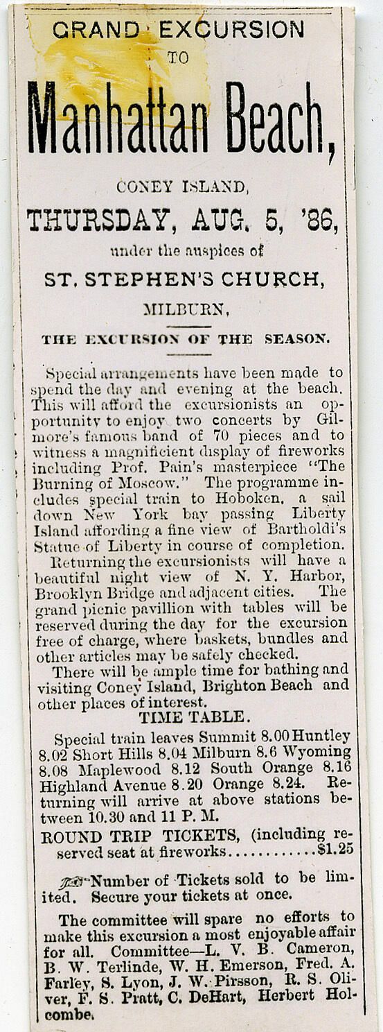 Advertisement for excursion starting from St. Stephen's Church to Manhattan Beach for a performance of the Burning of Moscow spectacle, followed by fireworks, sponsored by St. Stephen's Church.