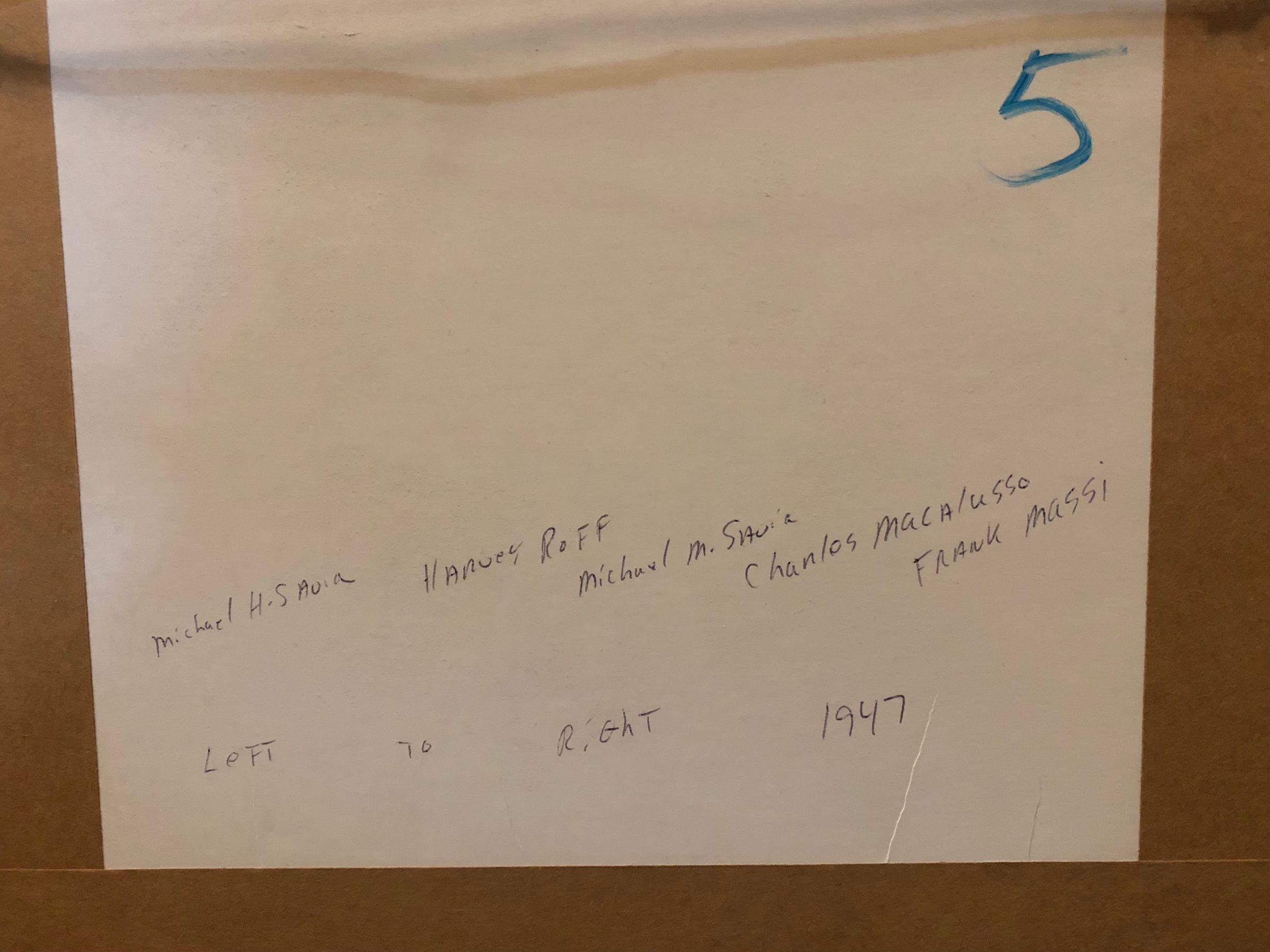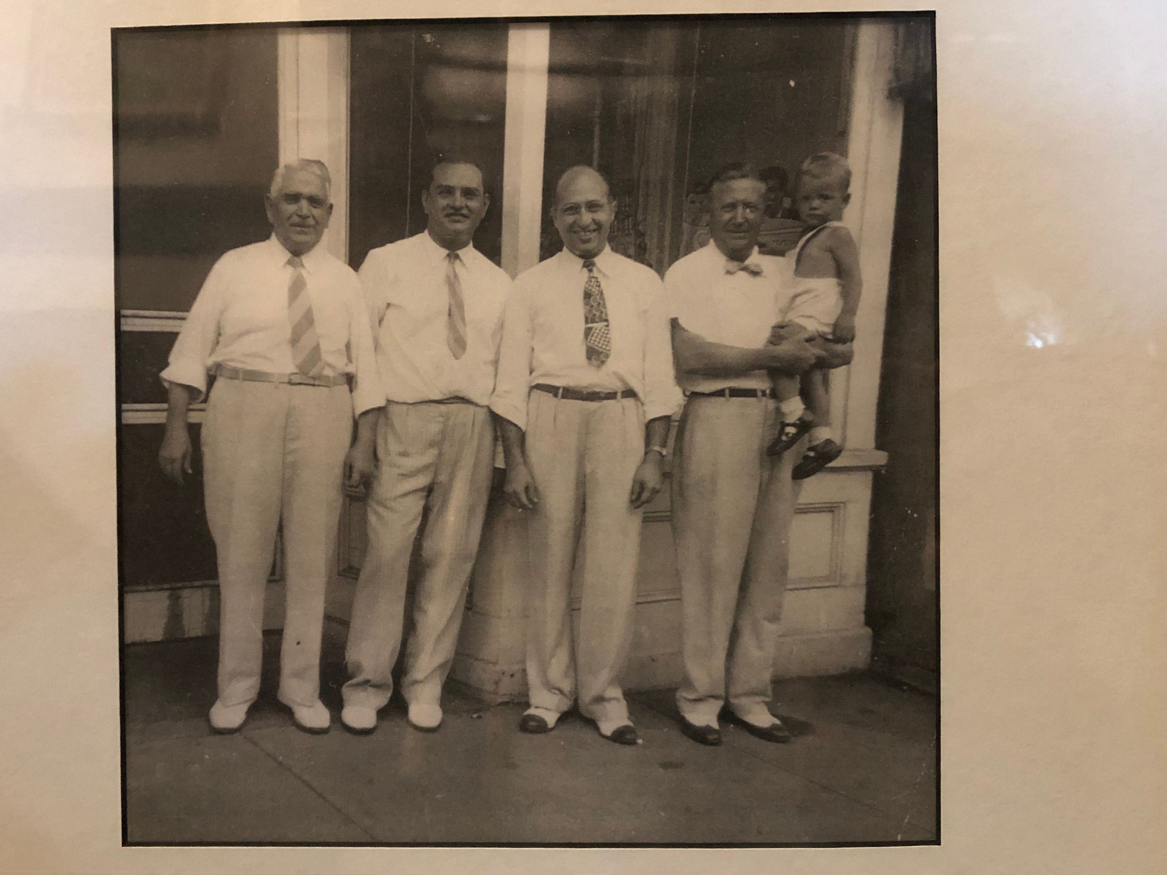 Photograph of men outside 44 Main Street, 1947. According to the identification on the back of the photograph, the men are (left to right); Michael H. Savia, Harvey Roff, Michael M. Savia, Charles Macalusso and Frank Masi, who is holding Michael H. Savia, Jr..Acquisition