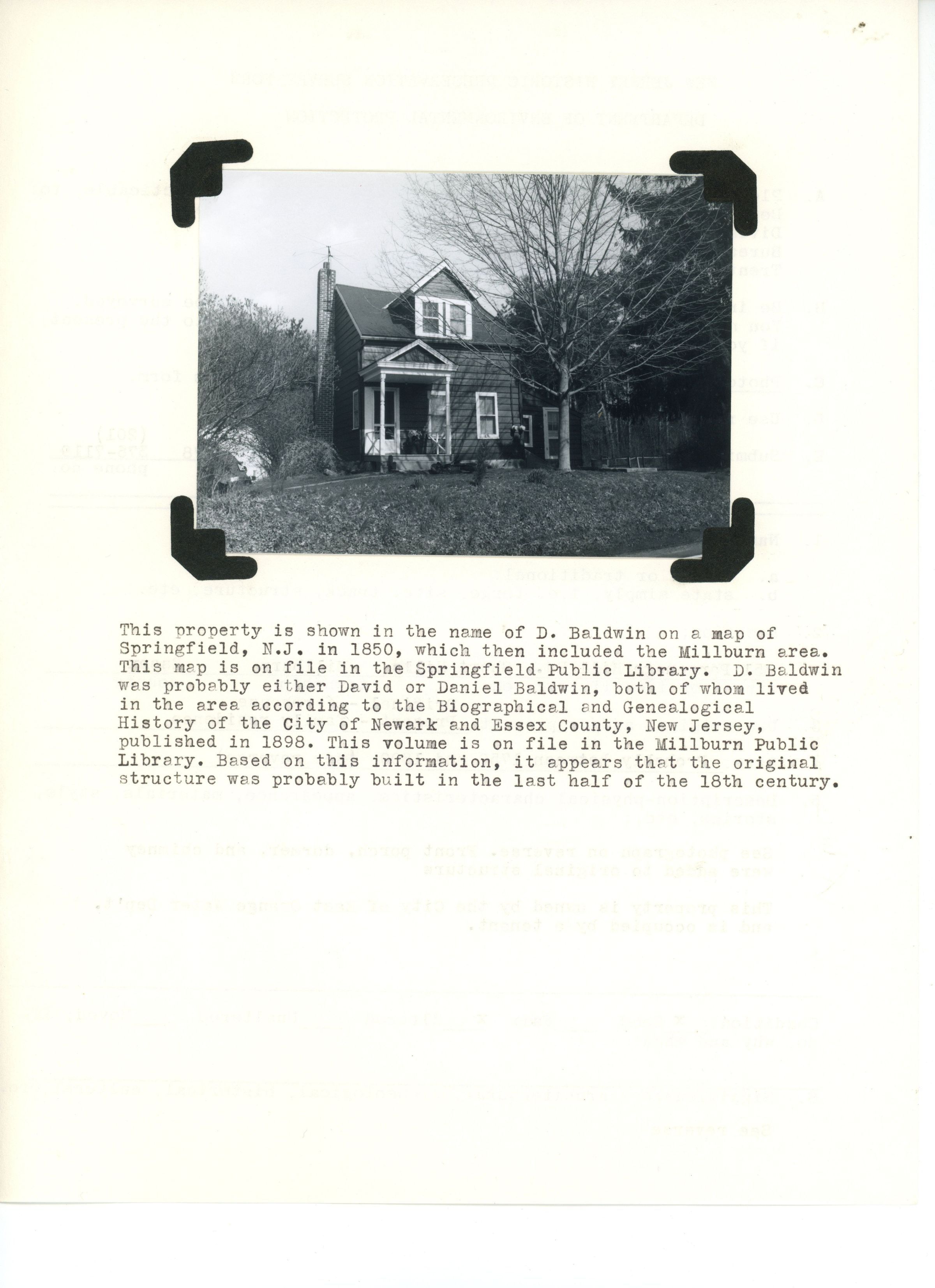 Photograph of 451 Parsonage Hill Road. The 1 1/2 Colonial clapboard farmhouse dates from the late 1700s and was on land owned by D. Baldwin in the mid 19th century. The land is now owned by the East Orange Water Company. The last record of the house comes from 1985.
