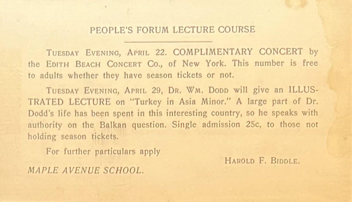 A notecard from Harold F. Biddle pertaining to People's Forum Lecture Course, which is being hosted at Maple Avenue School.Collection