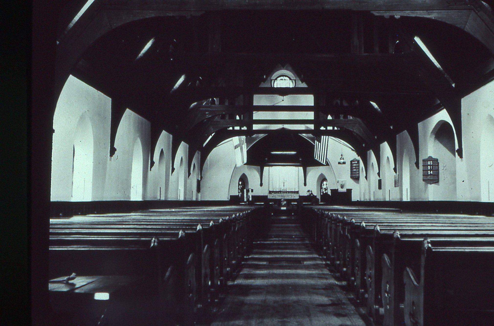 Two interior photographs of Christ Church after the 1916 addition. Photos show the view down the nave toward the altar and up the nave toward the rear of the church. Slides taken by Owen Lampe from the Christ Church archives.Collection
