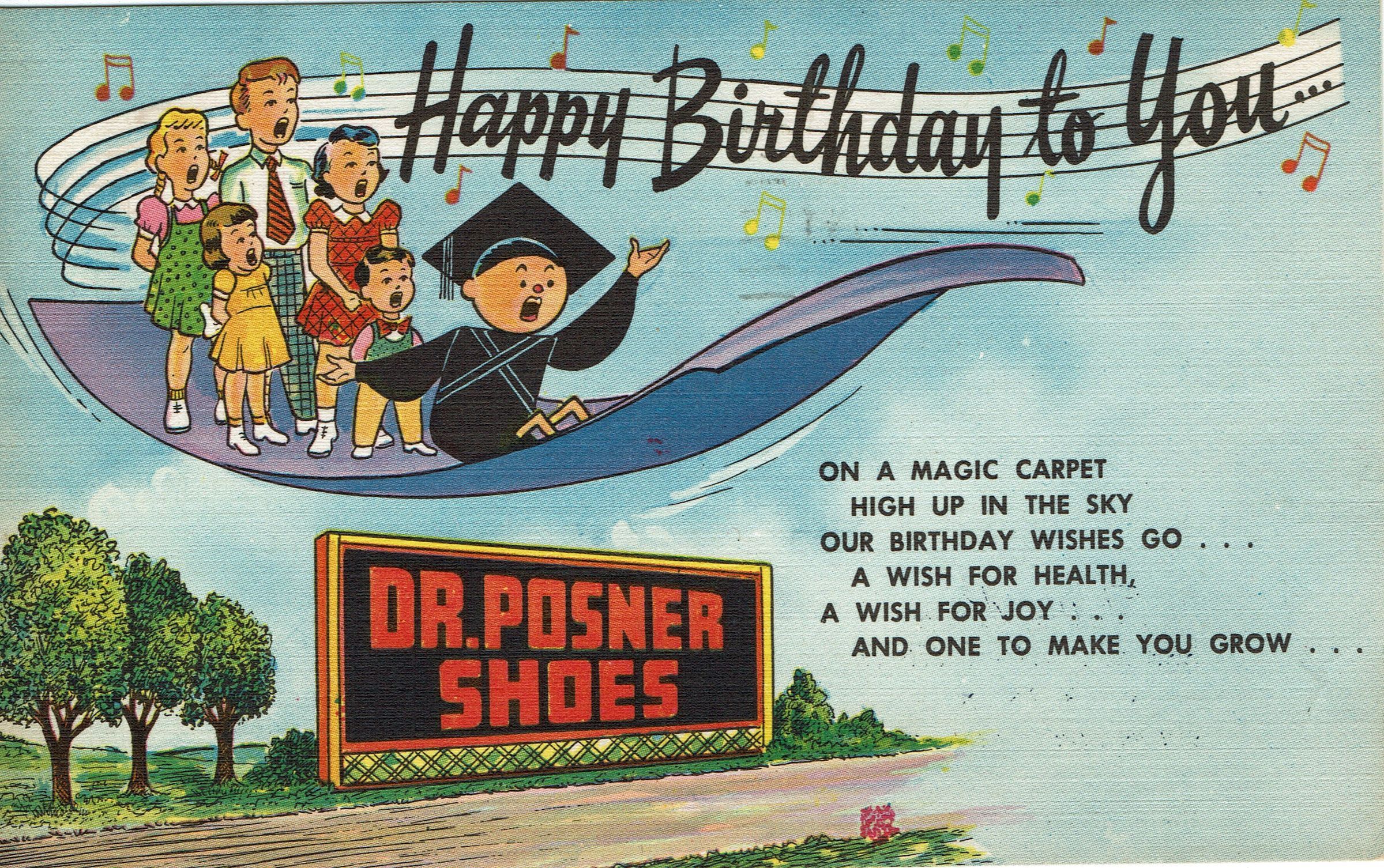 Postally used advertising postcard from Futter Brothers Shoe Store, 333 Millburn Avenue fearing Dr. Posner Shoes, postmarked Millburn, September 4, 1956. Card contains birthday greetings with a poem on the front. Verso contains message: Congratulation! You're certainly growing fast..Taller, Straighter and Smarter every day! We hope our Dr. Posner Shoes have helped you to have comfortable healthy feet and that mother will bring you in to see us again soon. Cordially yours, Futter Bros.