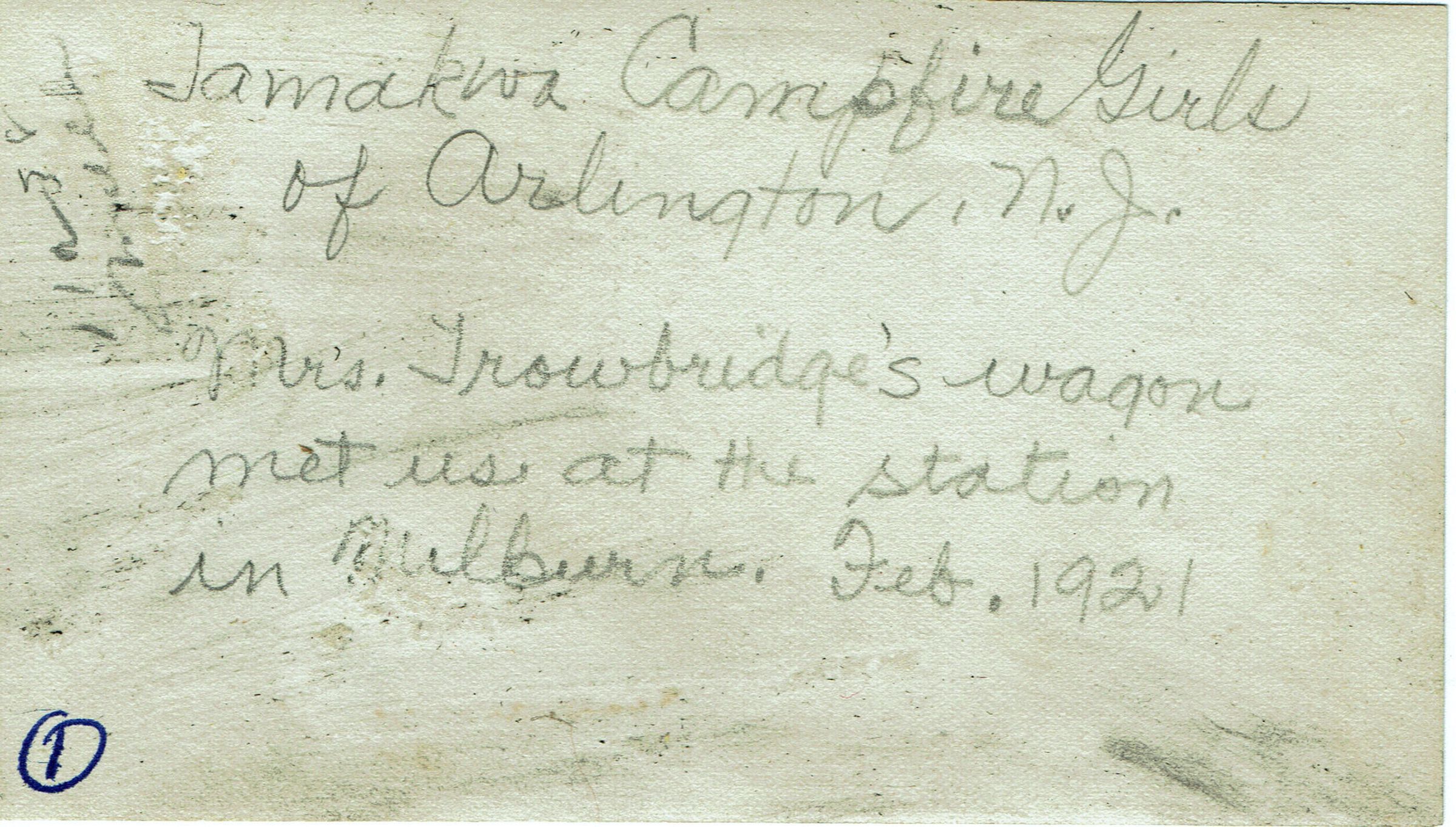 Photograph of Trowbridge Family with Tamakwa Campfire Girls of Arlington, N.J. from February, 1921. Inscription on back of photograph reads: Mrs. Trowbridge's wagon met us at the station in Millburn. Feb. 1921. According to photograph identification letter: Seated on wagon in front: George Trowbridge (Father), Laura Trowbridge (Daughter), Mrs. Noepel (Mrs. Trowbridge's sister) nee Sanford.Acquisition