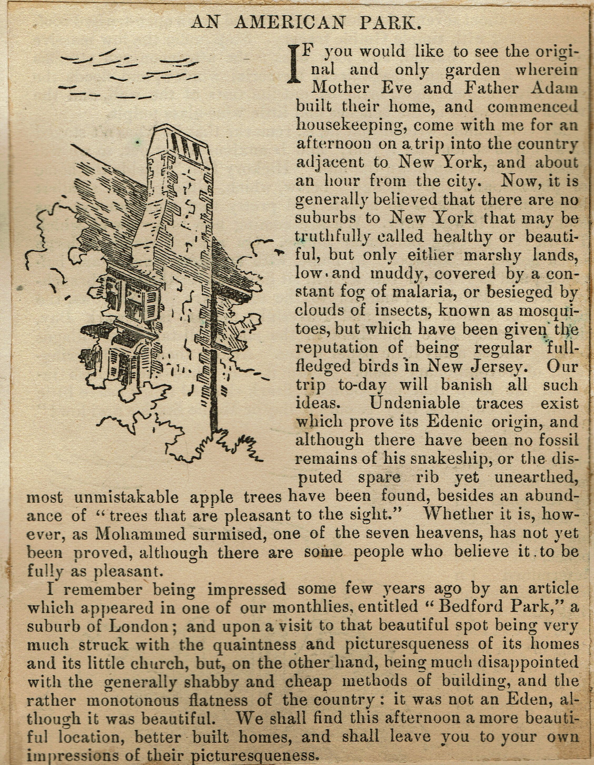 "An American Park," American Architect & Building News article, July 12, 1884 describing the architecture and landscape of Short Hills. The article describes traveling by train from New York City to Short Hills, New Jersey and contains illustrations of Stanford White's Music Hall (Casino/Racquet's Club), the Redstone, the Anchorage and Sunset Cottage. There are also 2 pages of B&W photographs entitled "Views of Short Hills." Other buildings described in the text include: The Short Hills Train Station, Greystone Cottage, and Knollwood.