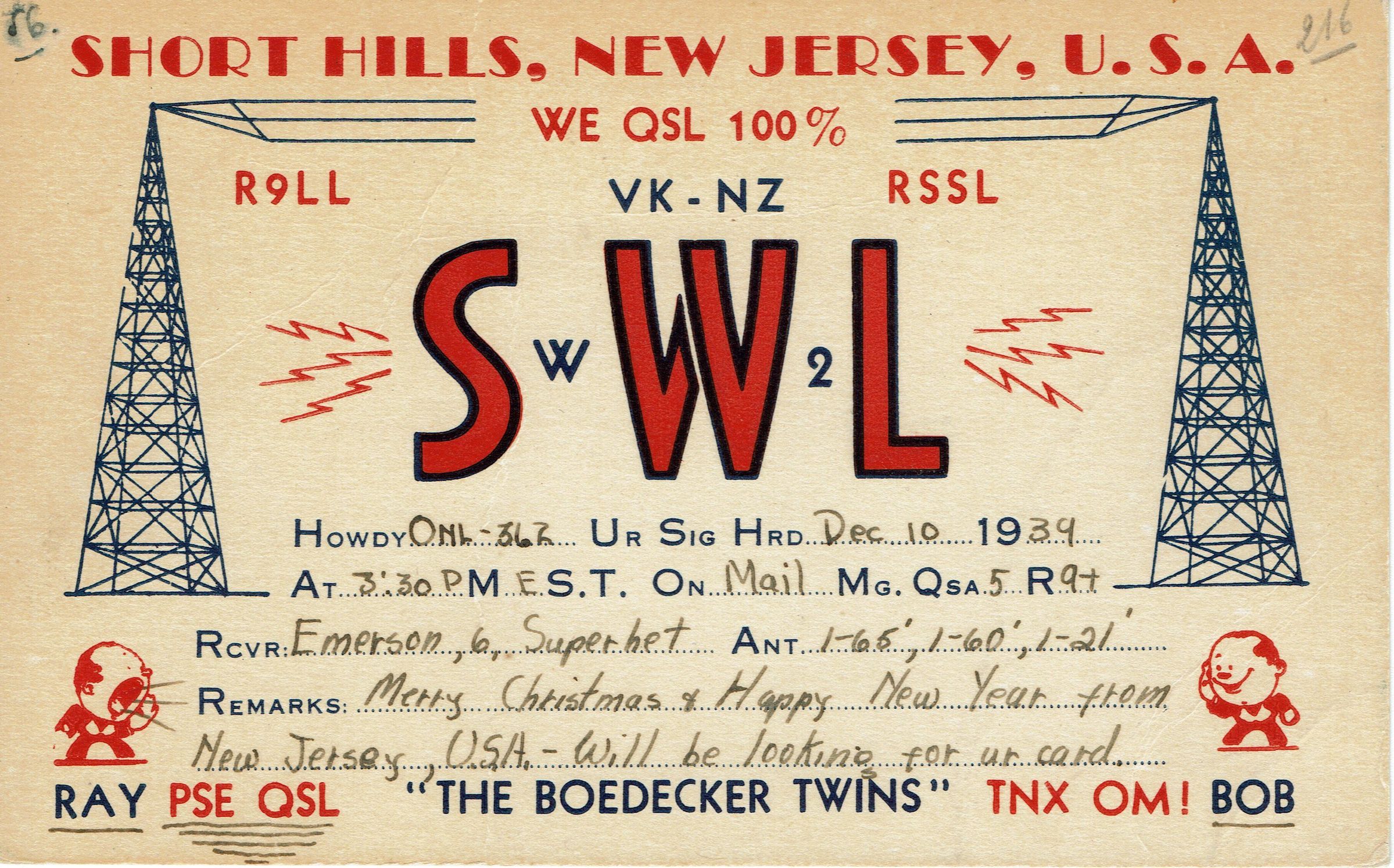 Short Wave Radio Listener Card issued to "The Boedecker Twins" on December 10, 1934.Acquisition