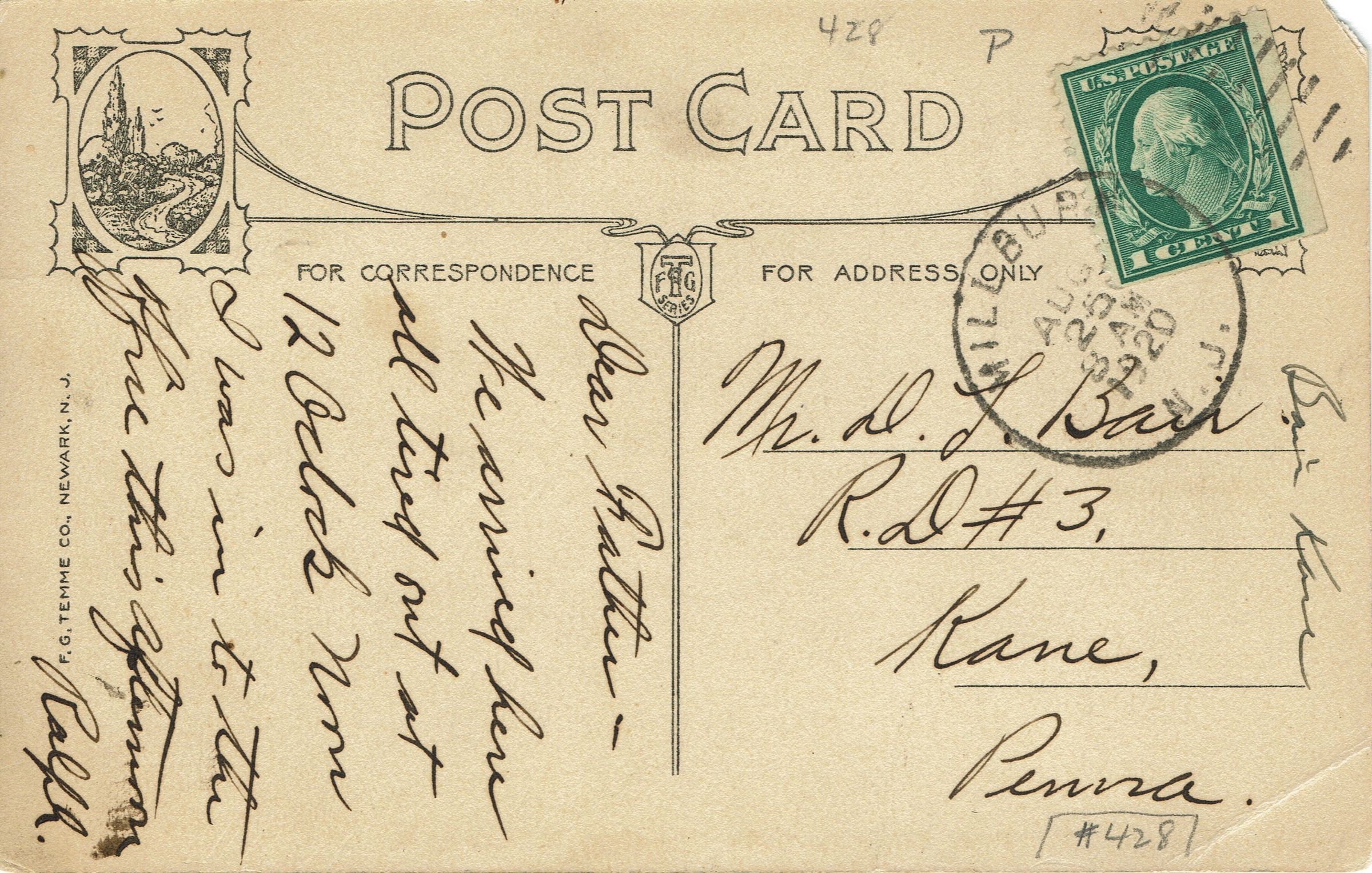 Photographic post card of the First National Bank Building on Main Street and Millburn Avenue, which also served as the Millburn Post Office (340 Millburn Avenue). Postally used, postmarked Millburn, August 25, 1920, 8:00 am and addressed to Mr. D.L. Barr, Road #3, Kane Pennsylvania. Image was used as #428 in the Centennial Photographic Collection,Collection