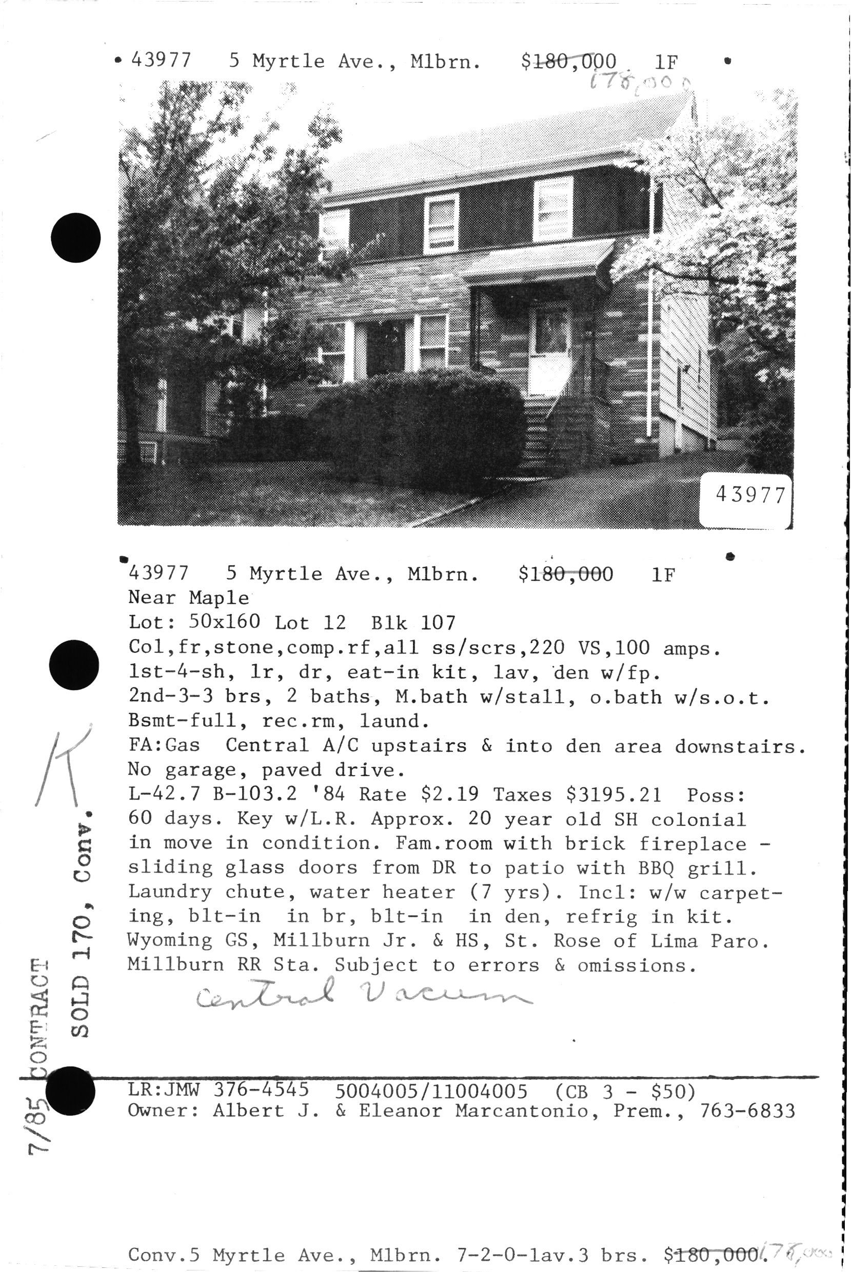 Information from David Gibson Historic Sites Survey: 5 Myrtle Avenue in the Wyoming section of Millburn was Built in 1964. Previous owners of the land included Theodore Price, Wilbur Price (1929), Richard Hightown (1957), 514 Corp. (1961), Albert J and Eleanor Marcantonio (1961).