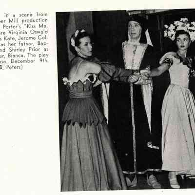 Paper Mill Playhouse Program for Kiss Me Kate, week starting November 20, 1956 with Ted Scott and Virginia Oswald. 10-page program with cast and production information. Extensively illustrated with B&W area advertisements.Collection