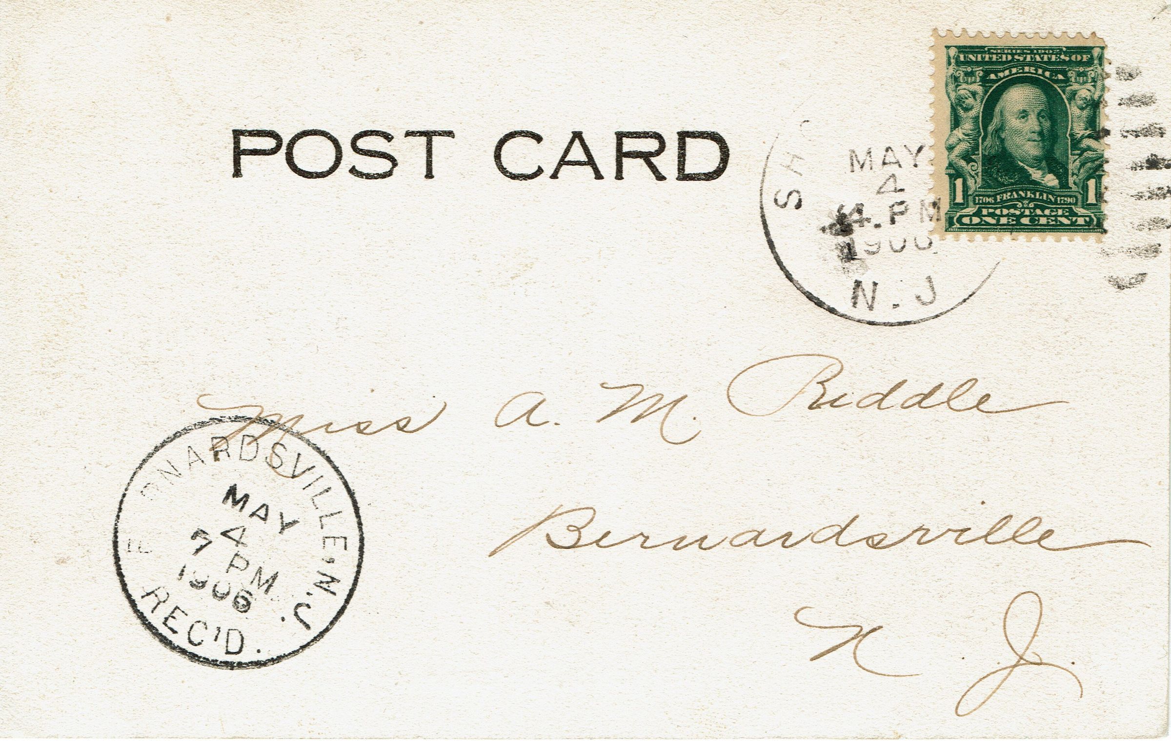 Postcard of the Short Hills School from the period in which it served as a high school. Postmarked Short Hills, May 4, 1906 at 4:00 pm, received Bernardsville, NJ May 4, 1906 at 7:00 pm. Addressed to Miss A.M. Riddle, Bernardsville, NJ. Message on front of card reads: "I'll write tonight about Sunday." May 4, 1906Collection