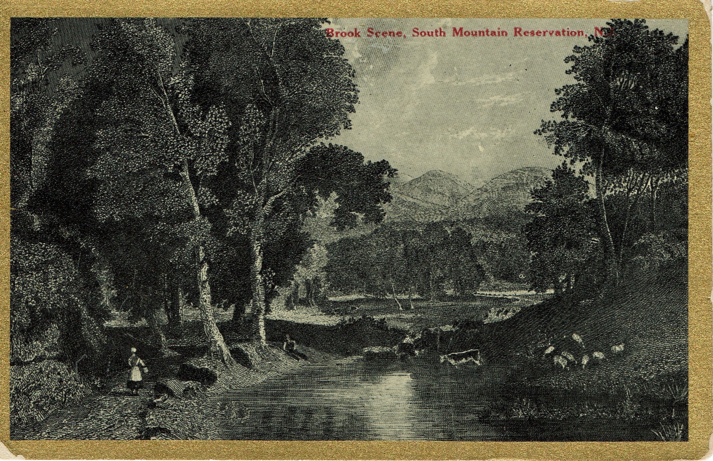 Postally unused, b&w postcard with an image taken from an engraving of the South Mountain Reservation, New Jersey, showing a pastoral brook scene woman walking along a path and cows by the river.Collection