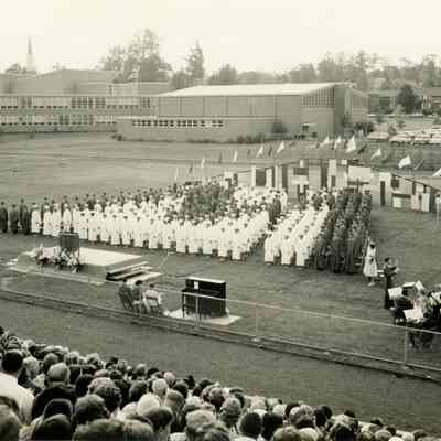 Photographs of the Millburn High School Commencement Exercises on June 22, 1961. The exercises were held on the athletic field. The MHS graduating class of 1961 had 245 students. These photographs come from the Robert Faddis testimonial binder. Faddis retired from the Millburn Public Schools in June 1961, having served the district for 37 years.Collection