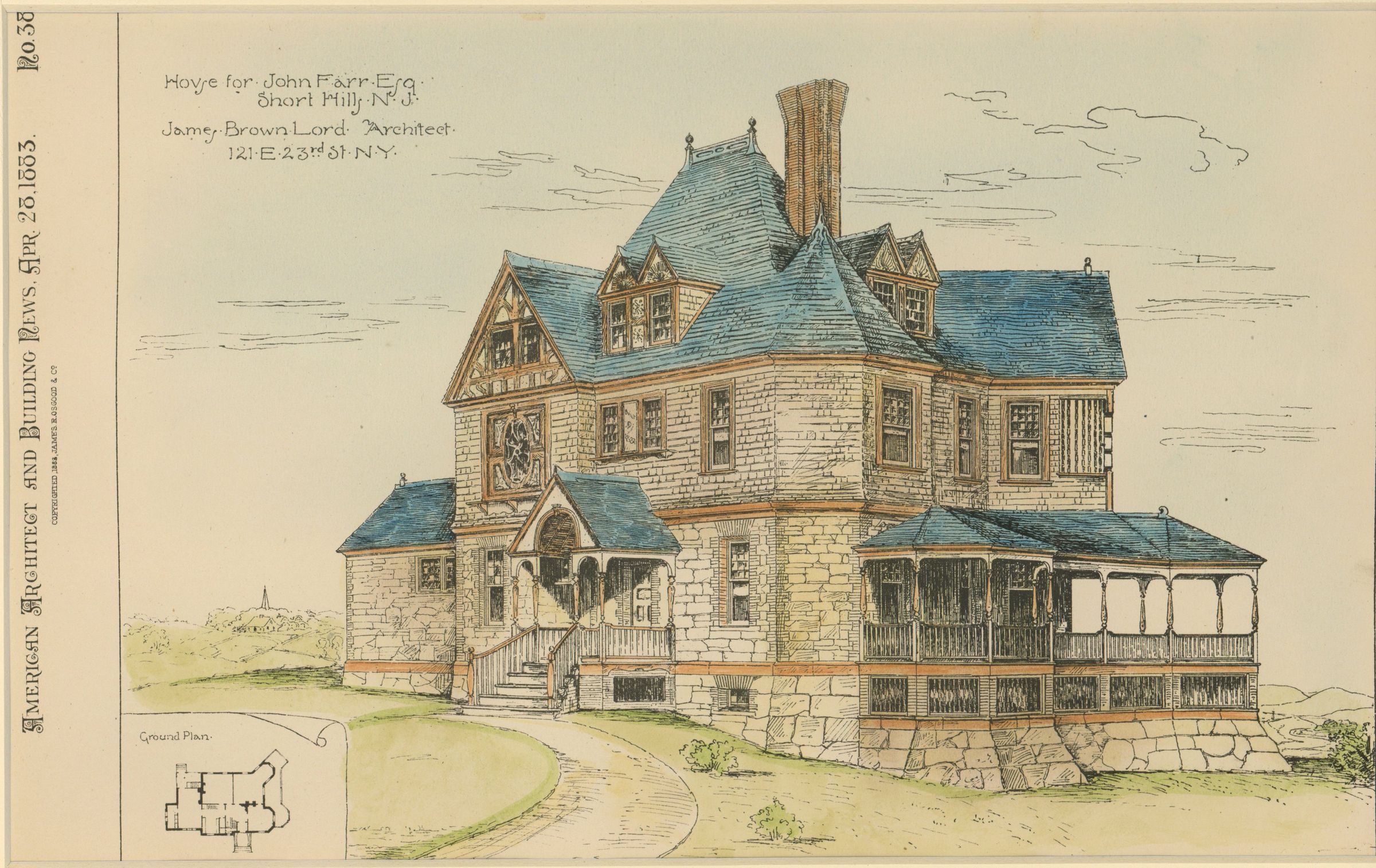 Hand-colored print of architect's drawing of house at 54 Western Drive from the periodical, "American Architect and Building News," April 25, 1883. Hartshorn House # 27. In upper left corner of print is written, "House for John Farr, Esq. Short Hills. N.J. James Brown Lord Architect. 121 E. 23rd St. N.Y.". In lower left corner is 1.75" X 1.25" black and white drawing of ground floor titled, "Ground Plan". Along entire left side is approx. 1" block with writing from bottom to top along side, "American Architect and Building News, Apr. 25, 1883. No. 38". Tiny writing underneath says, "Copyrighted 1883 James R. Osgood & Co."