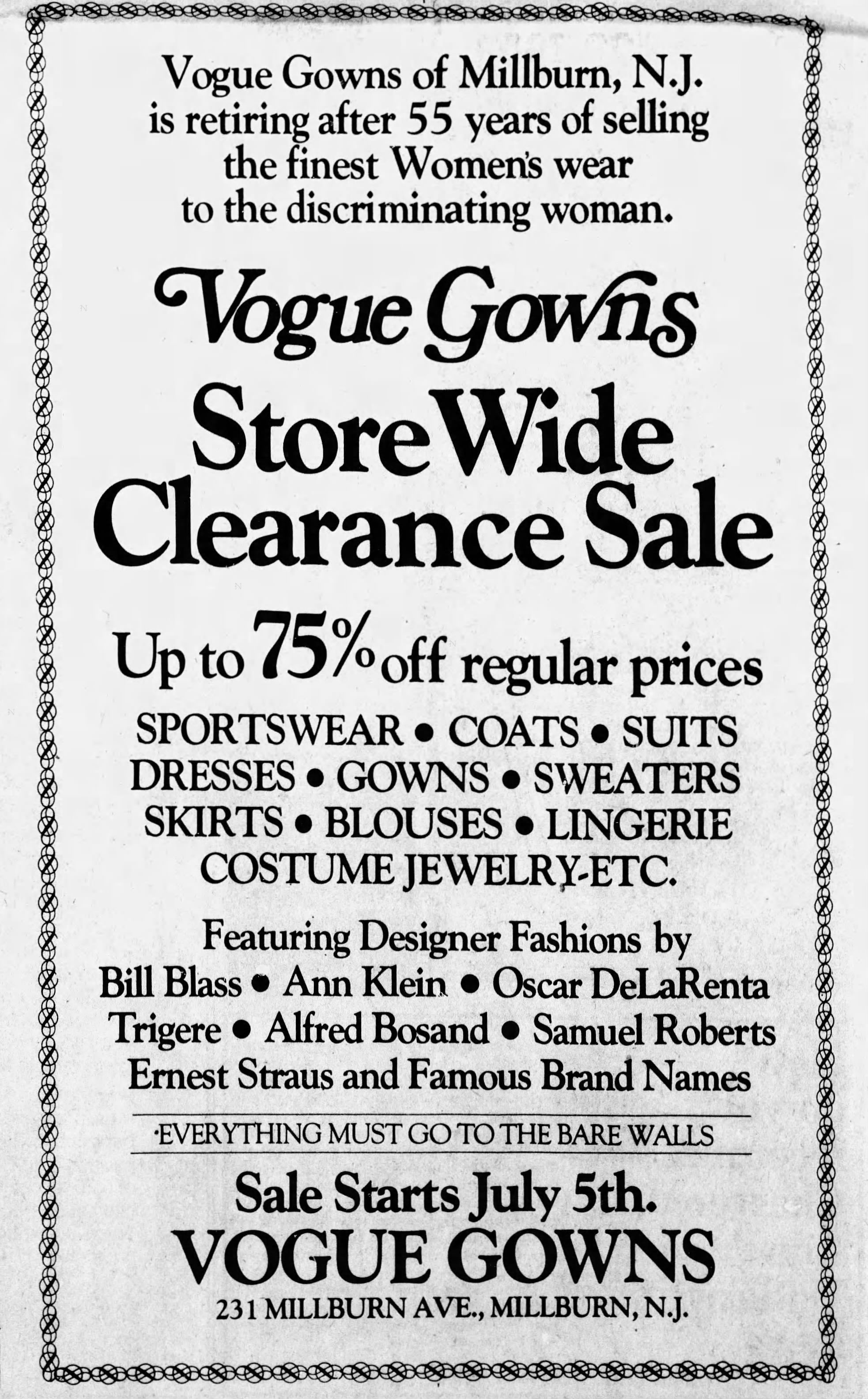 Vogue Gowns was owned by Lilian Baer, known professionally as Lilian LeBeaux, who operated the store with her partner Gertrude Gareis, for 55 years in Millburn. The partners retired in 1978 and the store closed in 1979.Acquisition