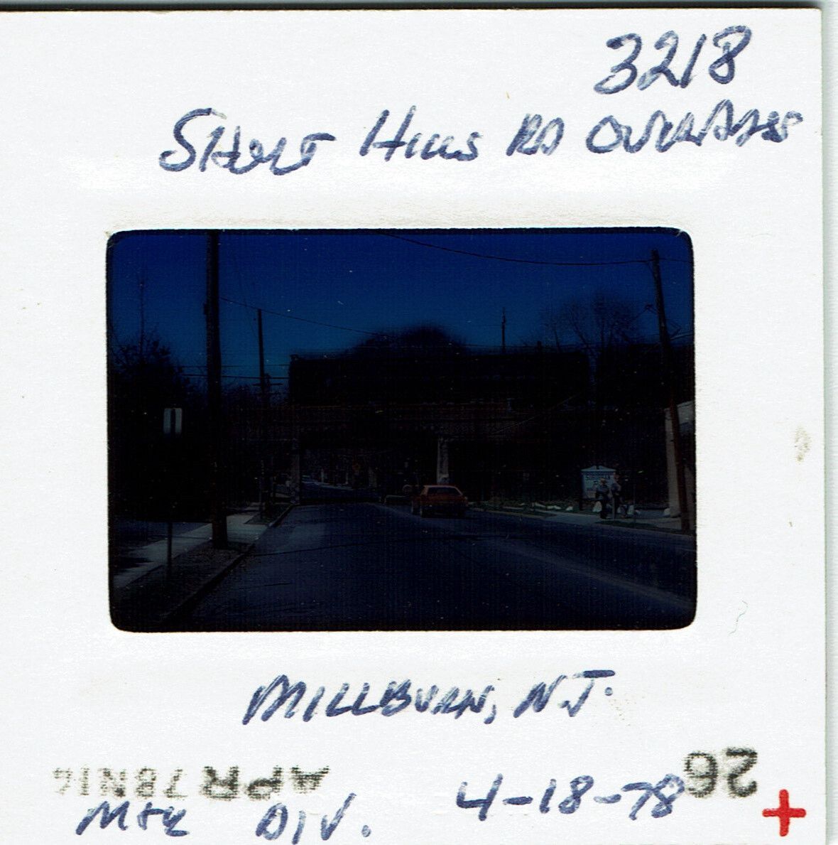 Color slide showing the Old Short Hills Road Overpass viewed from Main Street looking north. Suburban Paint store visible on right side. No print.Acquisition