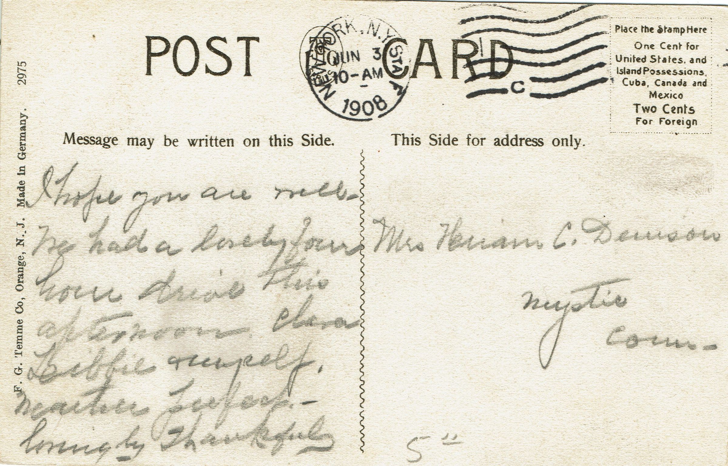 Postally used, postmarked New York, NY, June 3, 1908, 10:00 am. addressed to Mrs. Herian (sp) C. Denison, Mystic Connecticut.