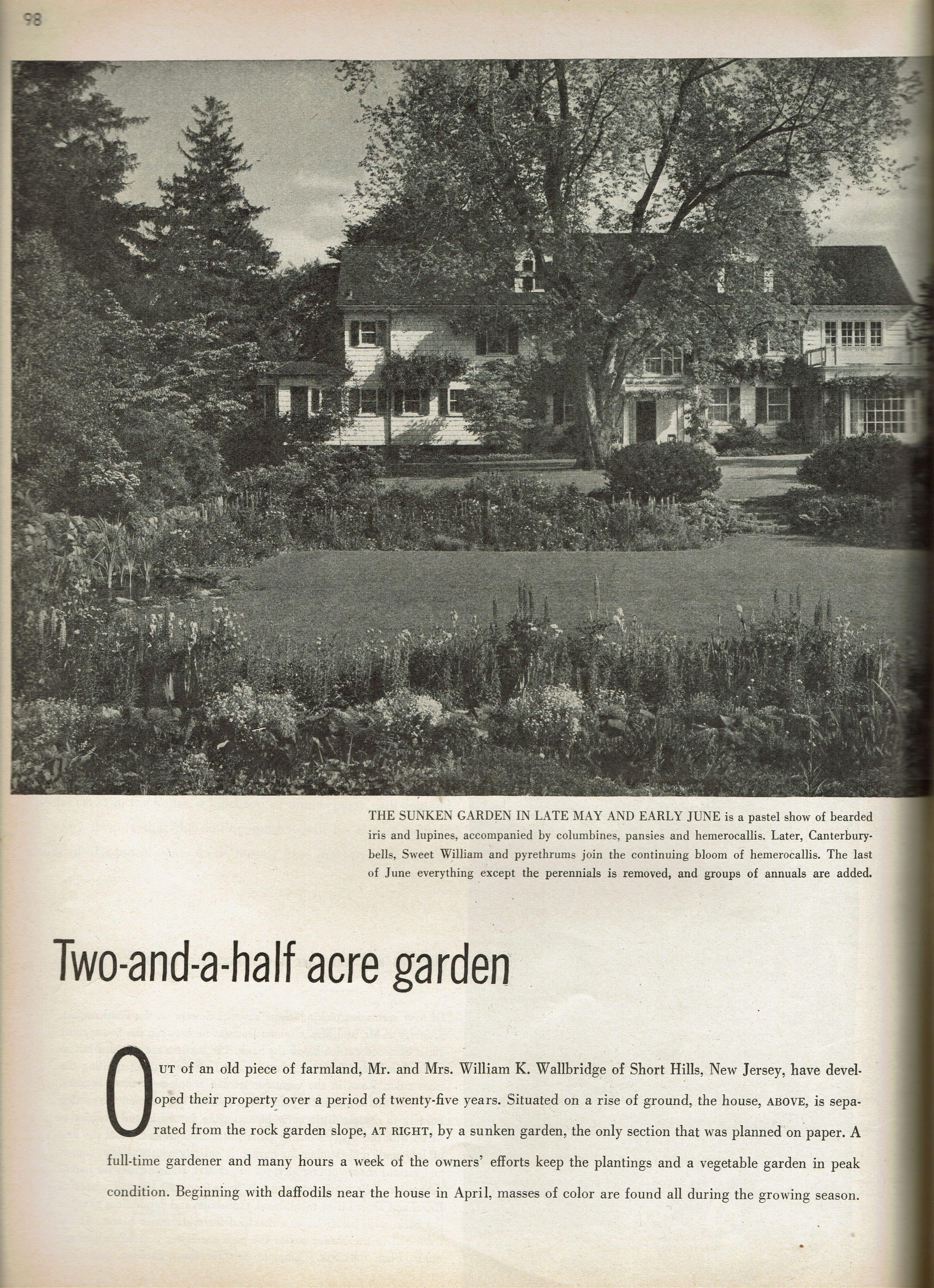 Article featuring the house and garden of Mr. and Mrs. William K. Wallbridge, 11 Jefferson Avenue, Short Hills from the April 1946 issue of House & Garden magazine, pp. 98-9.Acquisition